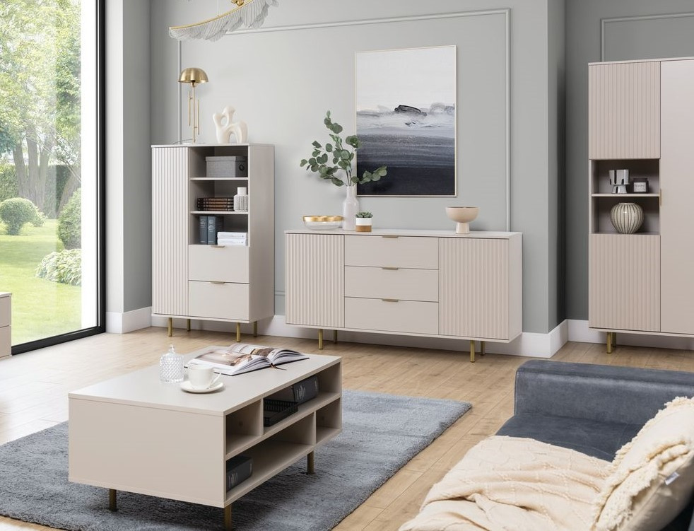 Ożyw swoje wnętrze wyjątkową szafą Aurora Long, który łączy minimalistyczny styl z praktyczną konstrukcją. Kolor cashmere lub czarny mat wprowadza do pomieszczenia harmonię i ciepło, a ryflowane fronty nadają mu niepowtarzalnego charakteru.