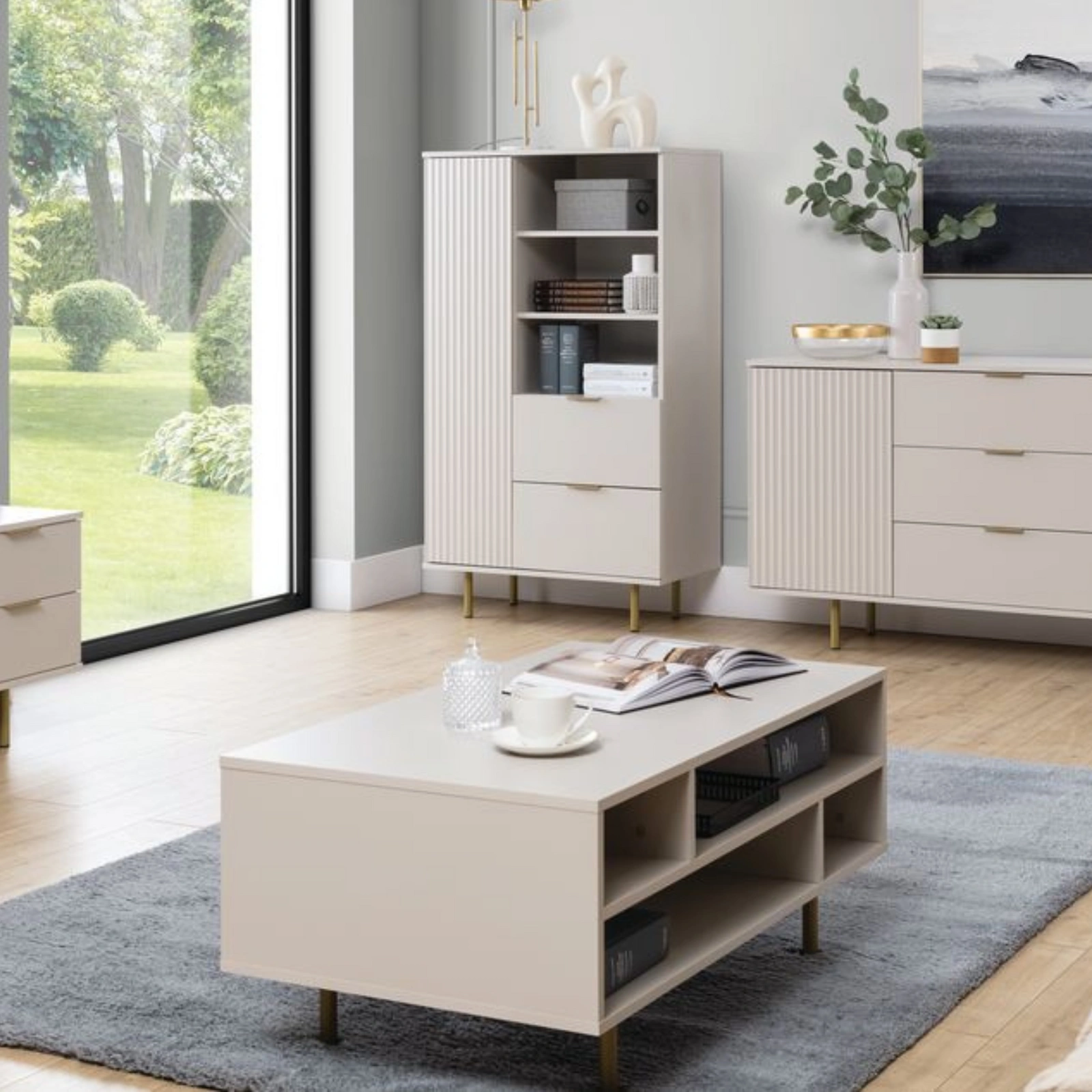 Wprowadź do swojego salonu lekkość, styl i funkcjonalność z nowoczesną ławą Aurora w odcieniu cashmere lub czarny mat.
