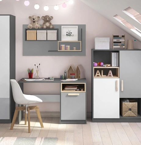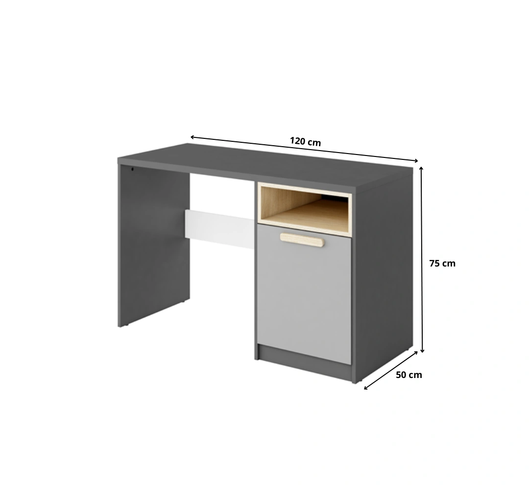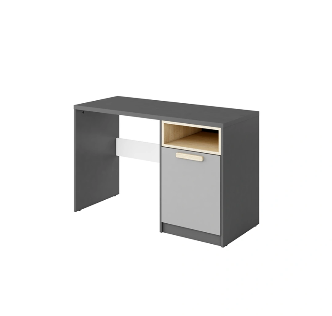 Praktyczne i nowoczesne biurko z kolekcji POK, zaprojektowane specjalnie do pokoju młodzieżowego. Biurko posiada parę drzwi, za którymi kryją się dwie półki, oraz dodatkową wnękę na sprzęt lub akcesoria, co pozwala na utrzymanie porządku i maksymalne wykorzystanie przestrzeni do nauki i pracy.