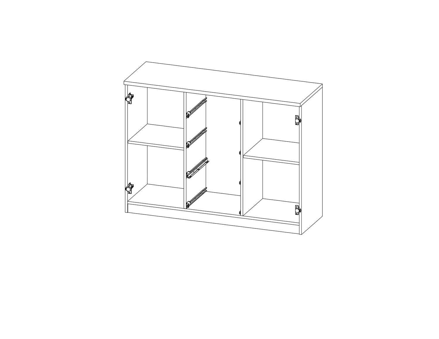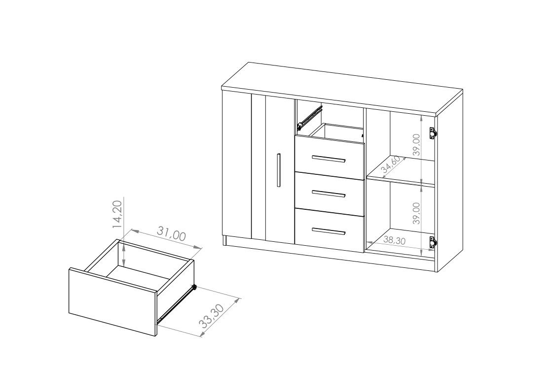 Solidna konstrukcja – korpus z płyty wiórowej 16 mm, wstawki w drzwiach 12 mm, a blat górny o grubości aż 22 mm gwarantują trwałość i stabilność.
