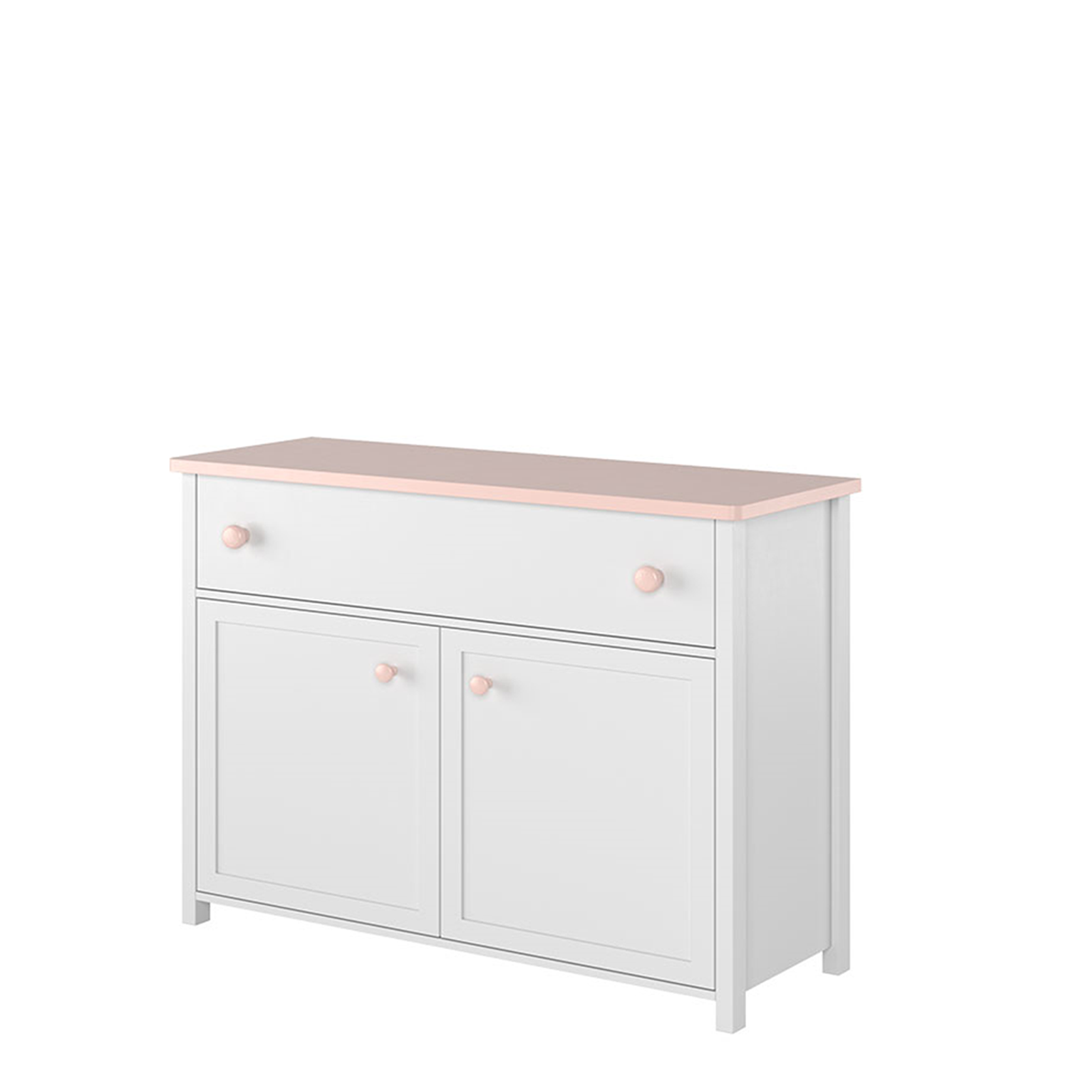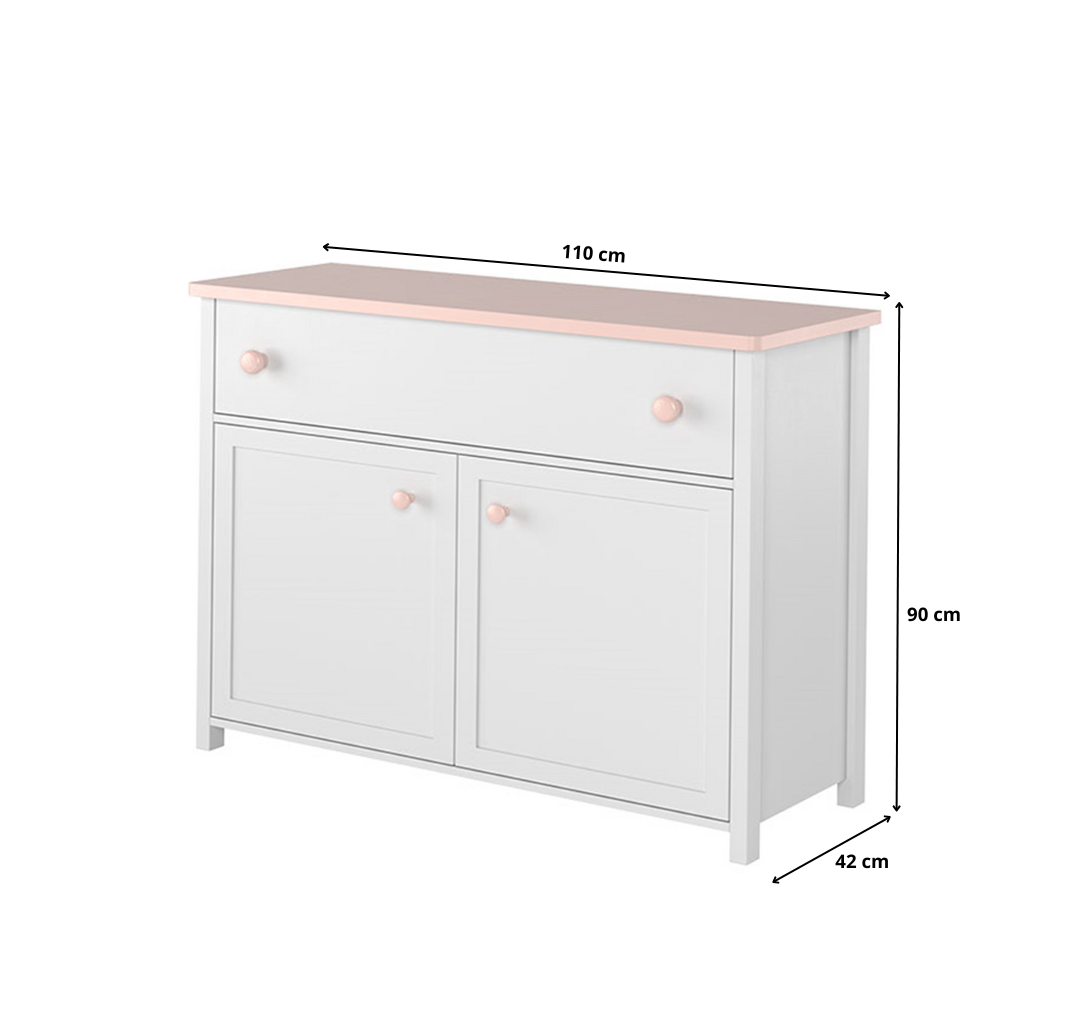 Funkcjonalna komoda z dwiema szafkami i jedną szufladą – idealna do pokoju młodzieżowego lub garderoby. Dzięki nowoczesnemu połączeniu koloru biały alpejski i różowy doskonale wpisuje się w modną aranżację wnętrza.