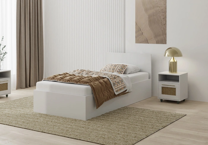 - Minimalistyczne łóżko jednoosobowe w kolorze białym to idealne rozwiązanie do małej sypialni, pokoju młodzieżowego lub gościnnego. Prosta forma i uniwersalny design sprawiają, że łatwo dopasujesz je do każdego wnętrza.