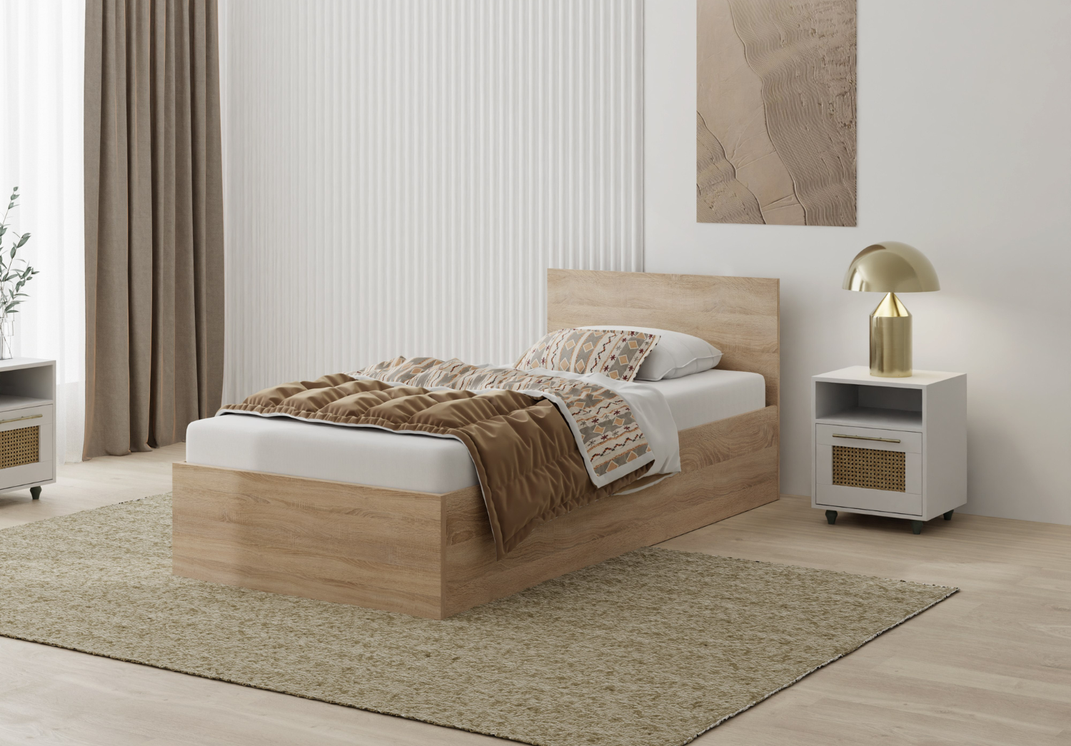 • Minimalistyczne łóżko jednoosobowe w kolorze dąb sonoma to idealne rozwiązanie do małej sypialni, pokoju młodzieżowego lub gościnnego. Prosta forma i uniwersalny design sprawiają, że łatwo dopasujesz je do każdego wnętrza.