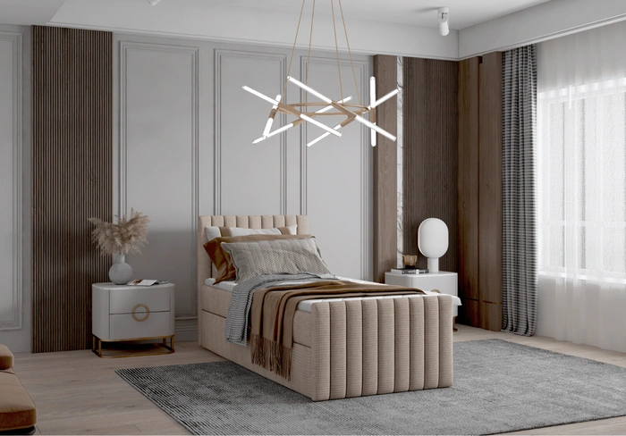 • Łóżko pojedyncze kontynentalne HERA – wygodne łóżko boxspring z topperem i eleganckim tapicerowaniem w pionowe pasy. Idealne do nowoczesnych i klasycznych sypialni.