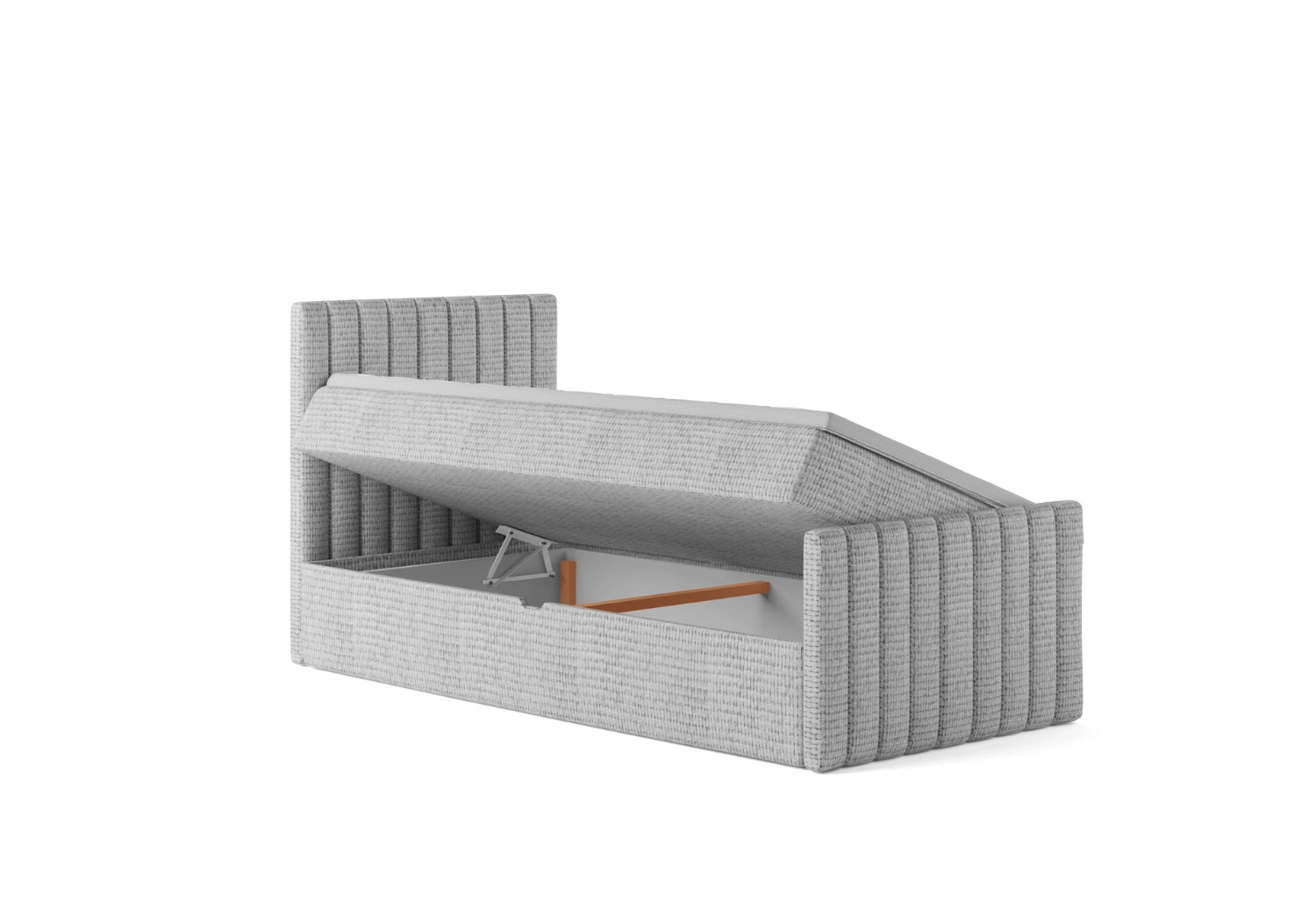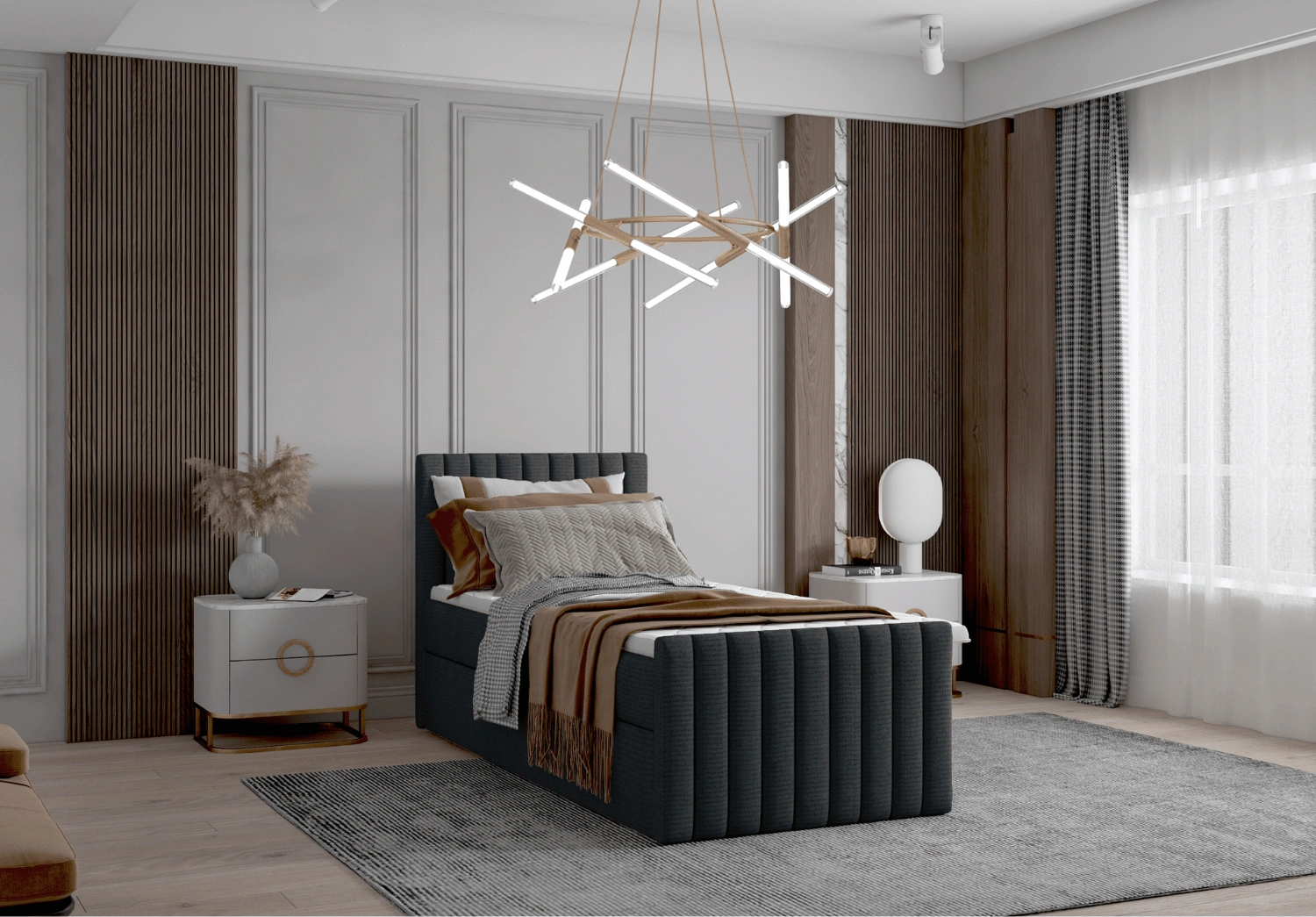 • Łóżko pojedyncze kontynentalne HERA – wygodne łóżko boxspring z topperem i eleganckim tapicerowaniem w pionowe pasy. Idealne do nowoczesnych i klasycznych sypialni.