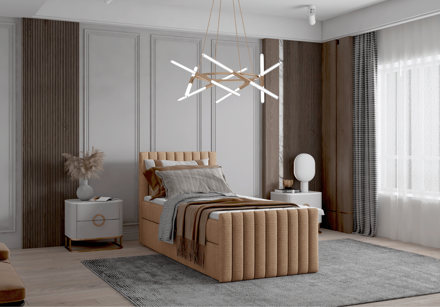 • Łóżko pojedyncze kontynentalne HERA – wygodne łóżko boxspring z topperem i eleganckim tapicerowaniem w pionowe pasy. Idealne do nowoczesnych i klasycznych sypialni.