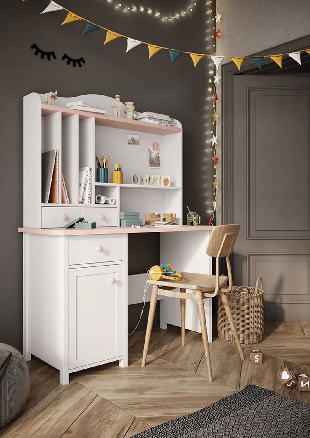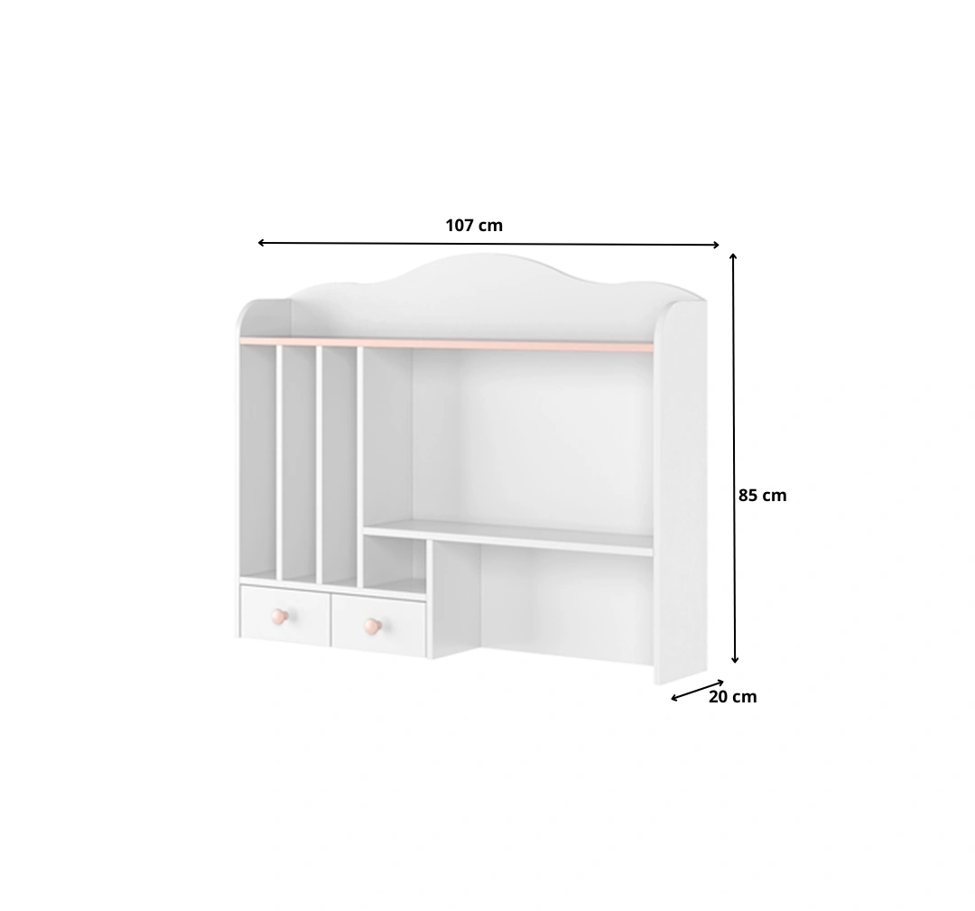 Praktyczna i stylowa nadstawka zaprojektowana z myślą o kolekcji LYSSA – doskonale pasuje do biurka, tworząc spójną i funkcjonalną przestrzeń do nauki oraz przechowywania. Połączenie bieli alpejskiej i różu wprowadza do wnętrza lekkość i dziewczęcy urok.