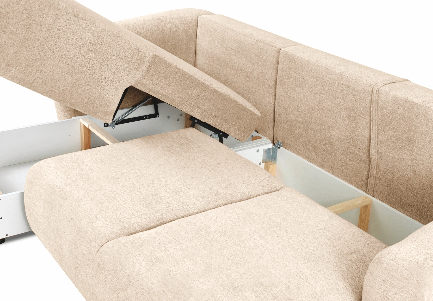 Wbudowany pojemnik na pościel ukryty pod siedziskiem pozwala przechowywać kołdry, poduszki czy koc, utrzymując porządek i estetykę we wnętrzu.