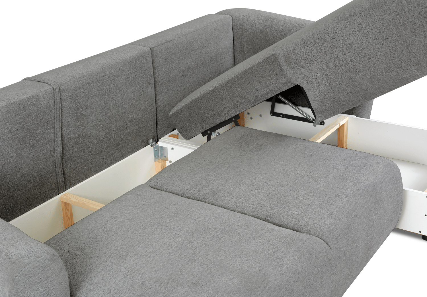 Wbudowany pojemnik na pościel ukryty pod siedziskiem pozwala przechowywać kołdry, poduszki czy koc, utrzymując porządek i estetykę we wnętrzu.
