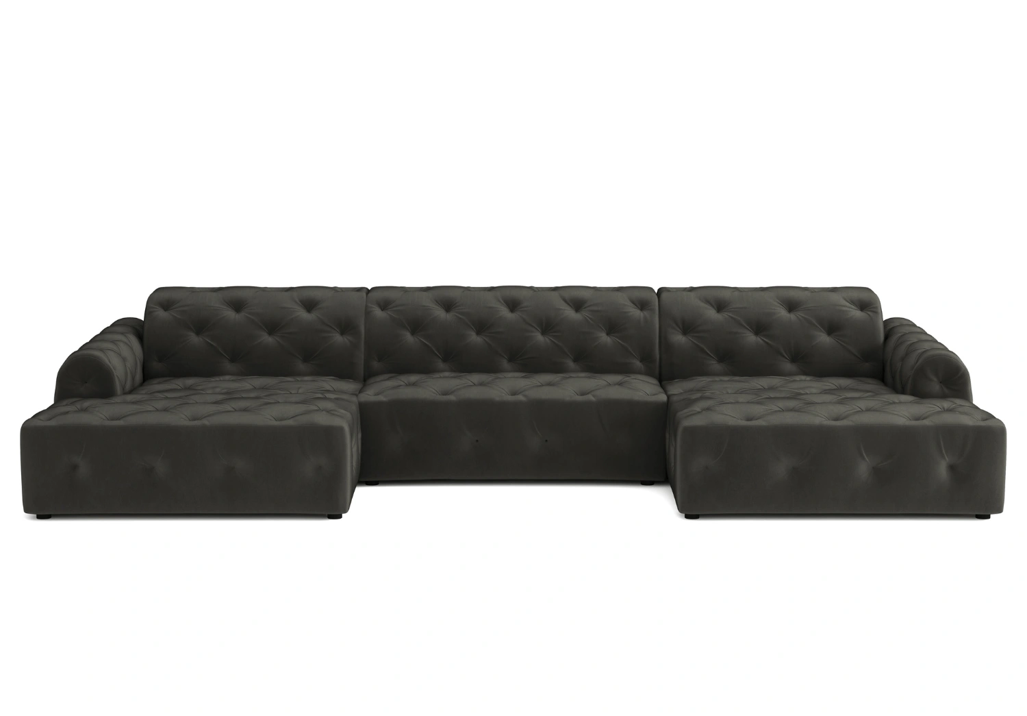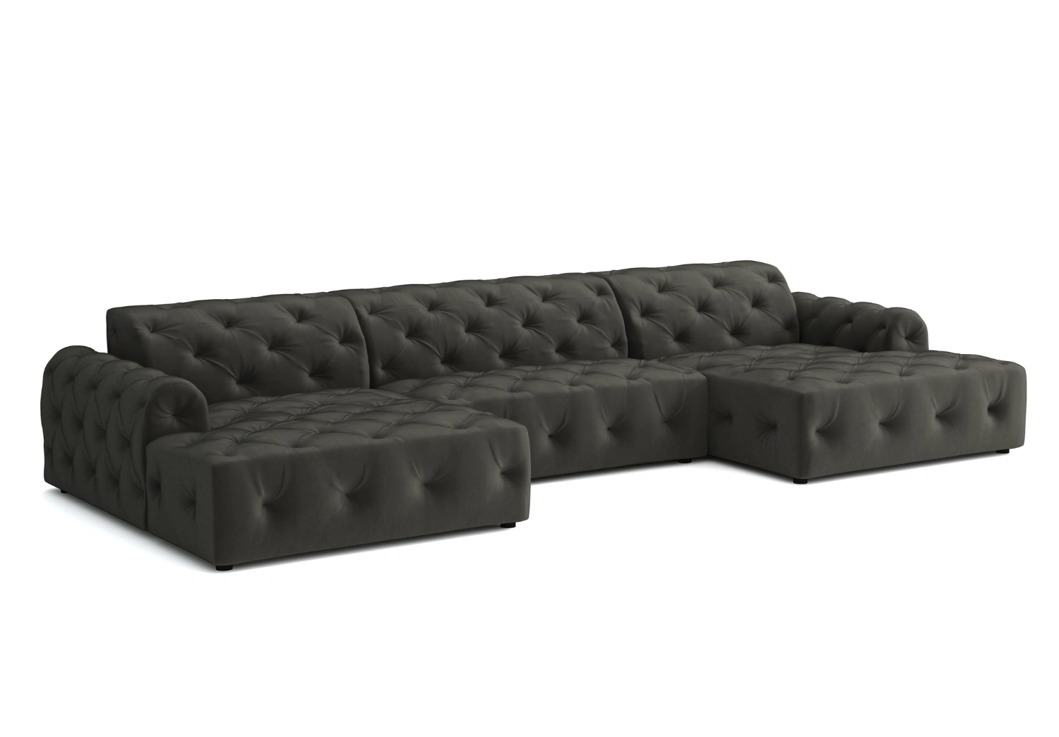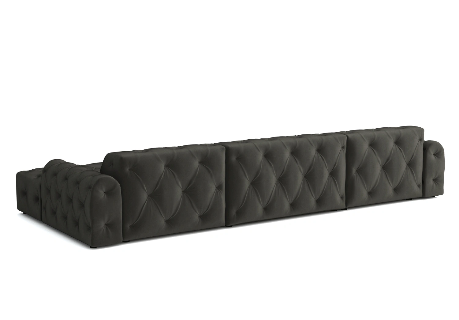 Głębokie pikowania z ozdobnymi guzikami tworzą eleganckie, romboidalne zagłębienia na powierzchni tapicerki.