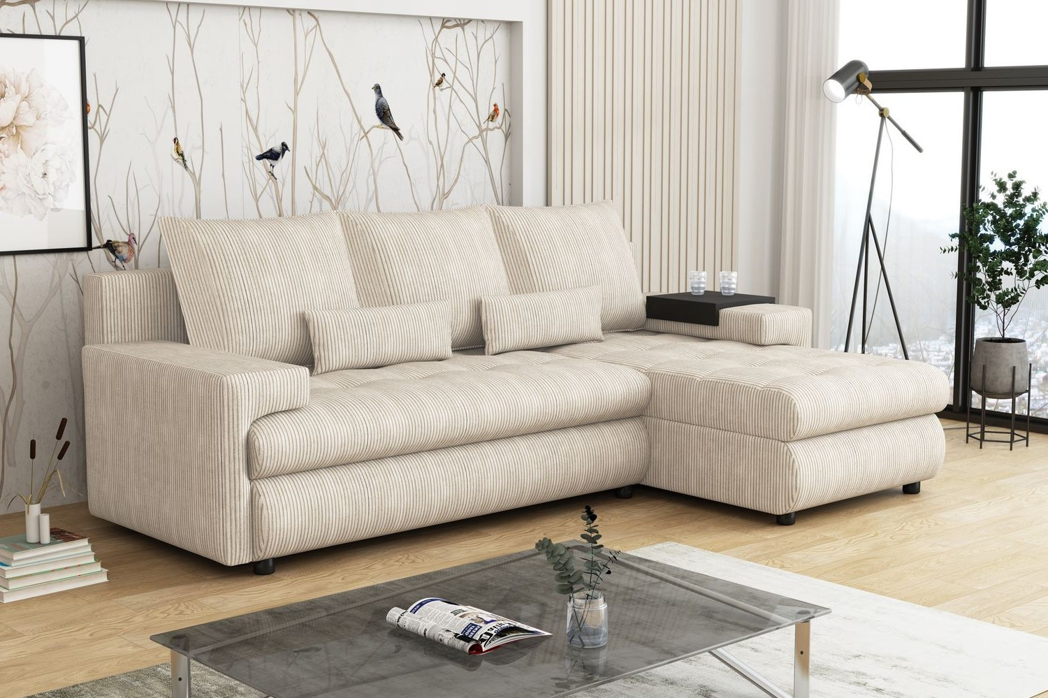 Narożnik wyróżnia się minimalistycznym, nowoczesnym designem, który podkreśla mięsista tkanina sztruksowa POSO.