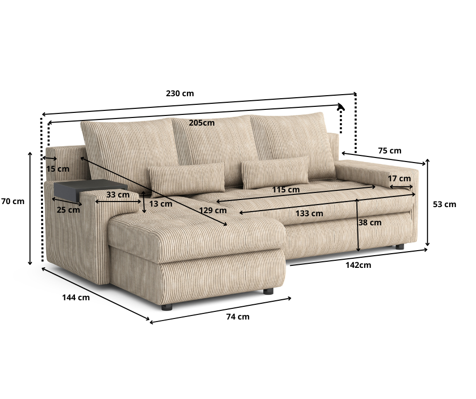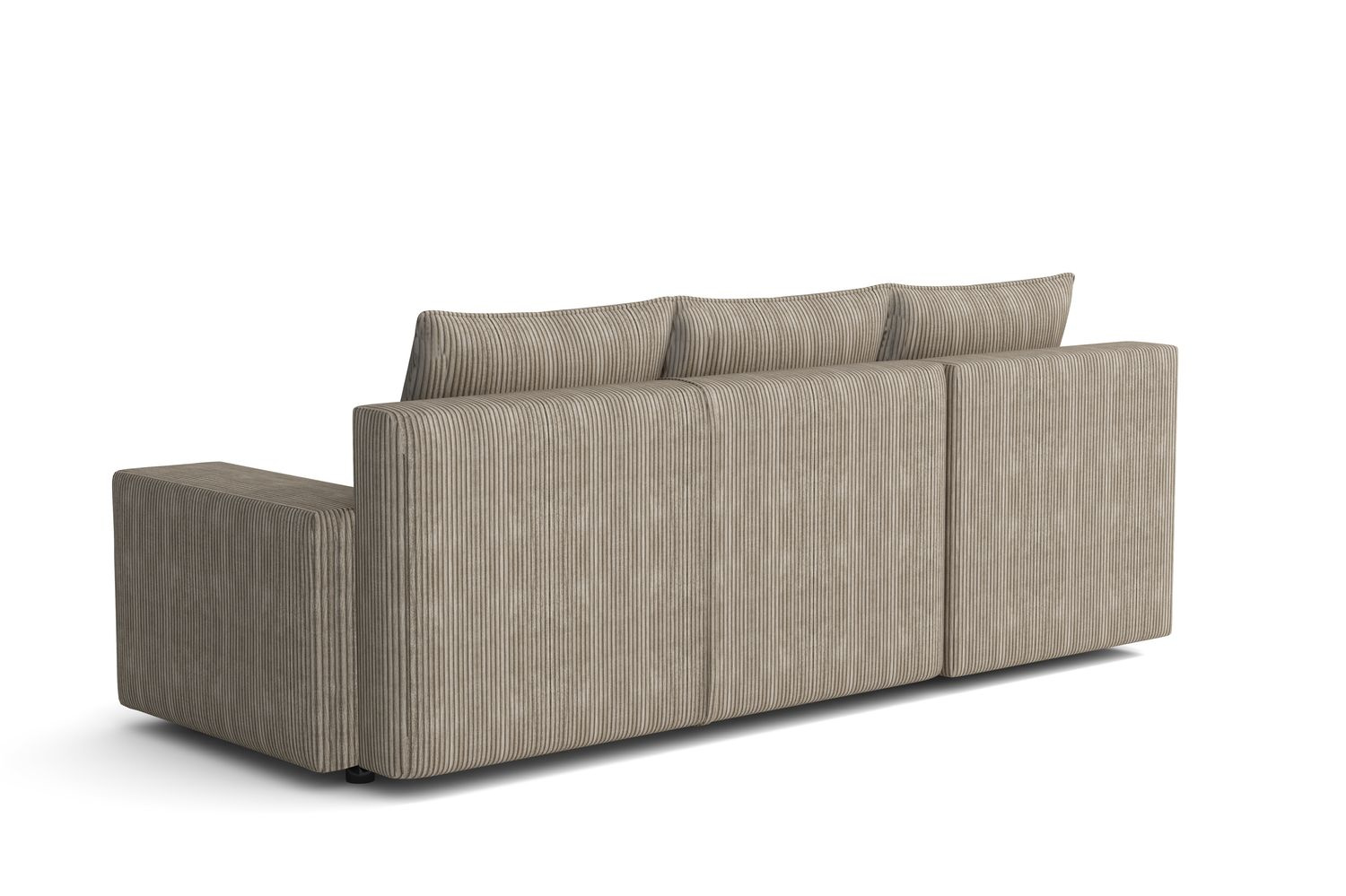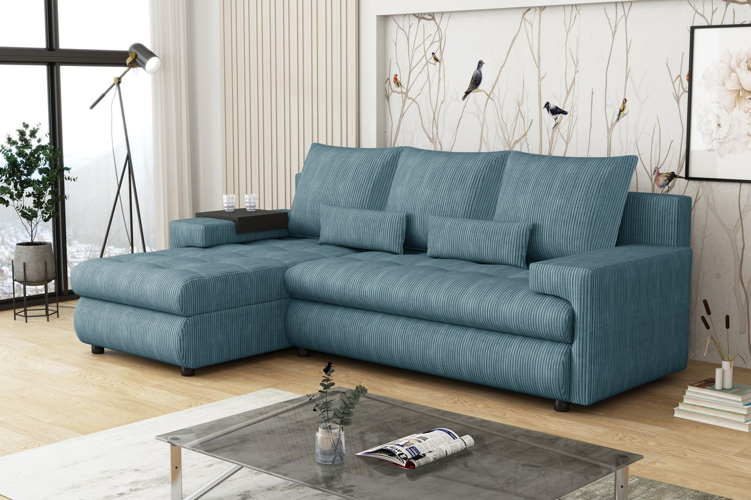 Narożnik wyróżnia się minimalistycznym, nowoczesnym designem, który podkreśla mięsista tkanina sztruksowa POSO.