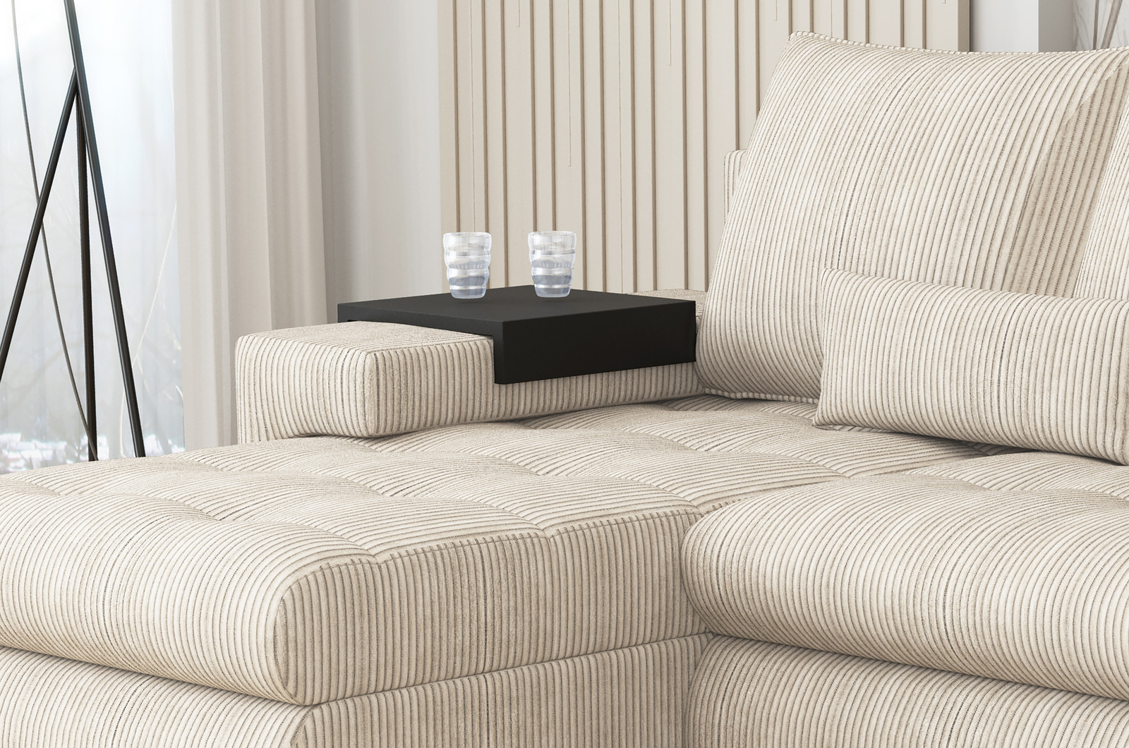 Narożnik wyróżnia się minimalistycznym, nowoczesnym designem, który podkreśla mięsista tkanina sztruksowa POSO.
