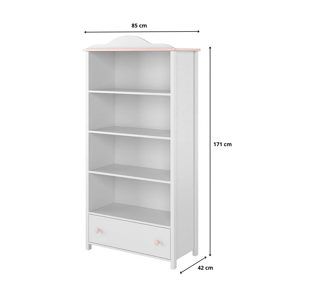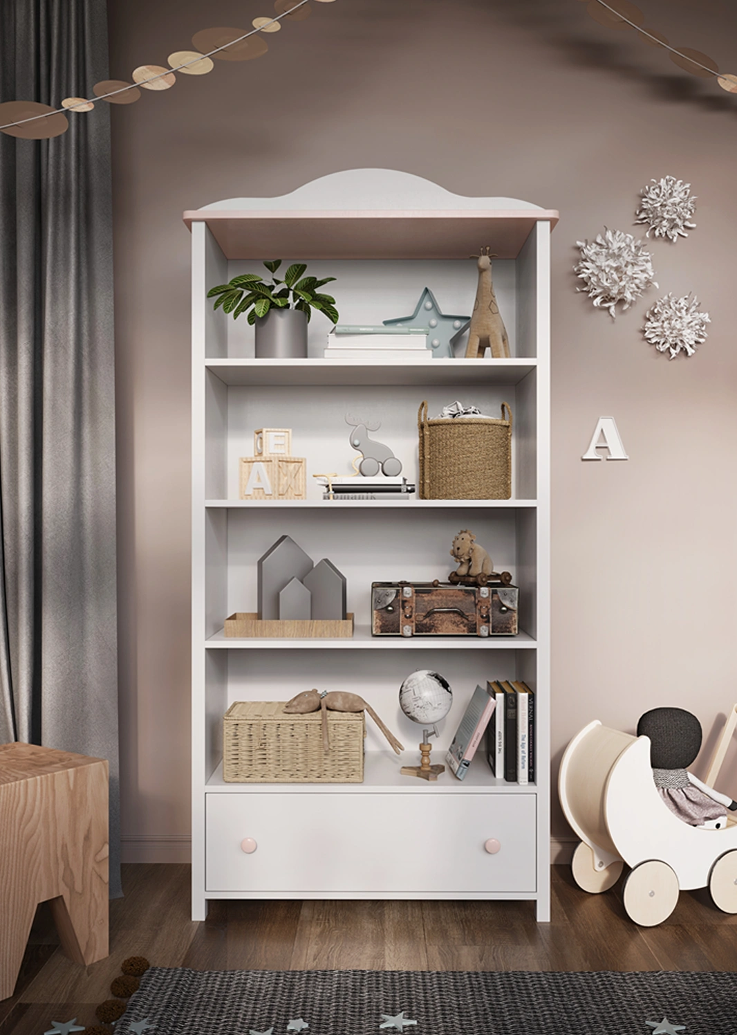 Praktyczne i estetyczne rozwiązanie do pokoju młodzieżowego, zaprojektowane w subtelnych kolorach biały alpejski/różowy. Z połączeniem nowoczesnego designu i przemyślanej funkcjonalności, świetnie sprawdzi się do przechowywania książek, dekoracji czy szkolnych akcesoriów.