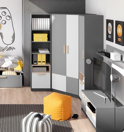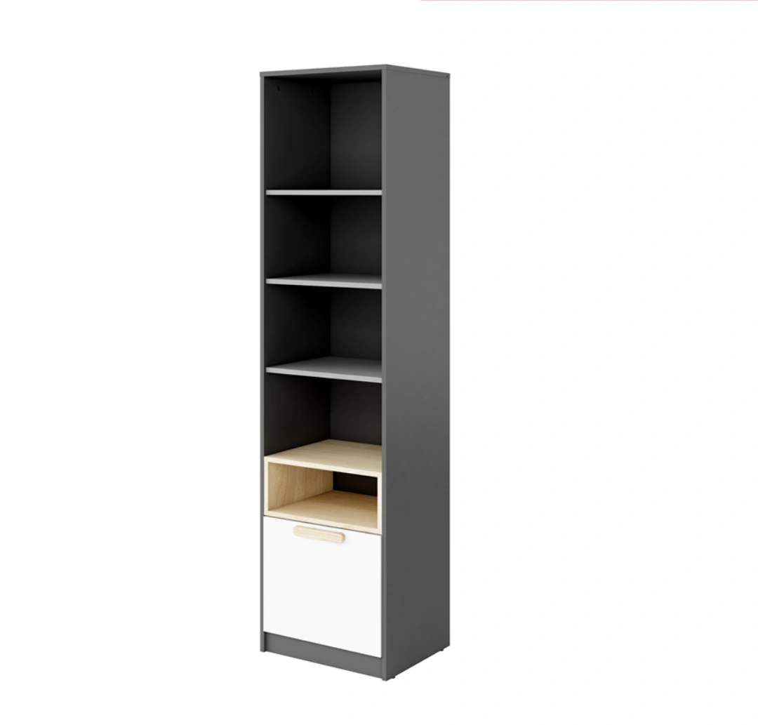 Nowoczesny i praktyczny regał narożny, idealny do pokoju młodzieżowego. Mebel posiada jedną pojemną szufladę oraz pięć półek, które zapewniają dużo miejsca do przechowywania książek, dekoracji czy innych przedmiotów codziennego użytku. Kolorystyka łączy grafitowy korpus z elementami buk ibsen i frontem w białym alpejskim odcieniu, nadając meblowi świeży i stylowy wygląd.