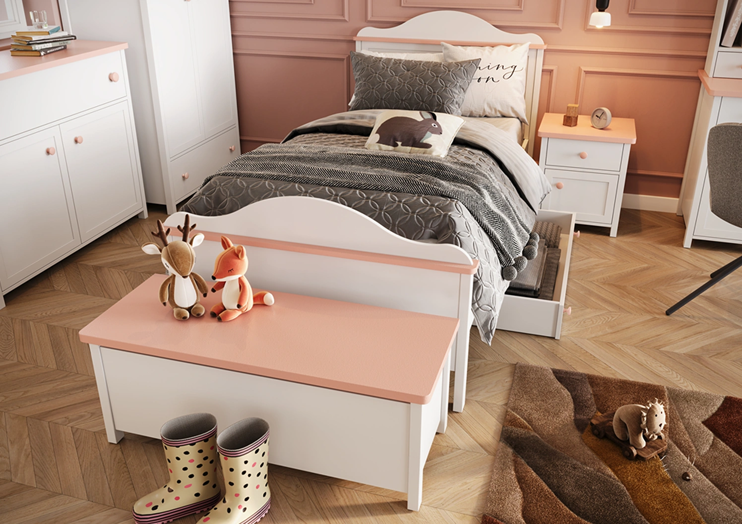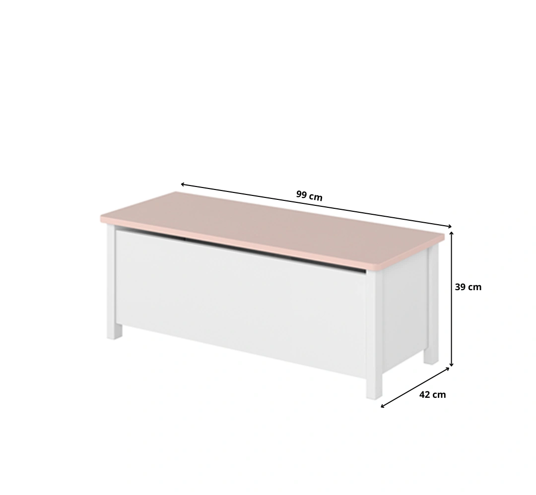 Praktyczny kontenerek z kolekcji LYSSA, idealny do przechowywania zabawek, pościeli, koców czy drobiazgów. Dzięki nowoczesnemu designowi i połączeniu bieli z różem świetnie wpisuje się w aranżacje pokoju młodzieżowego lub sypialni.