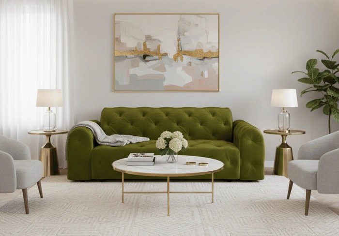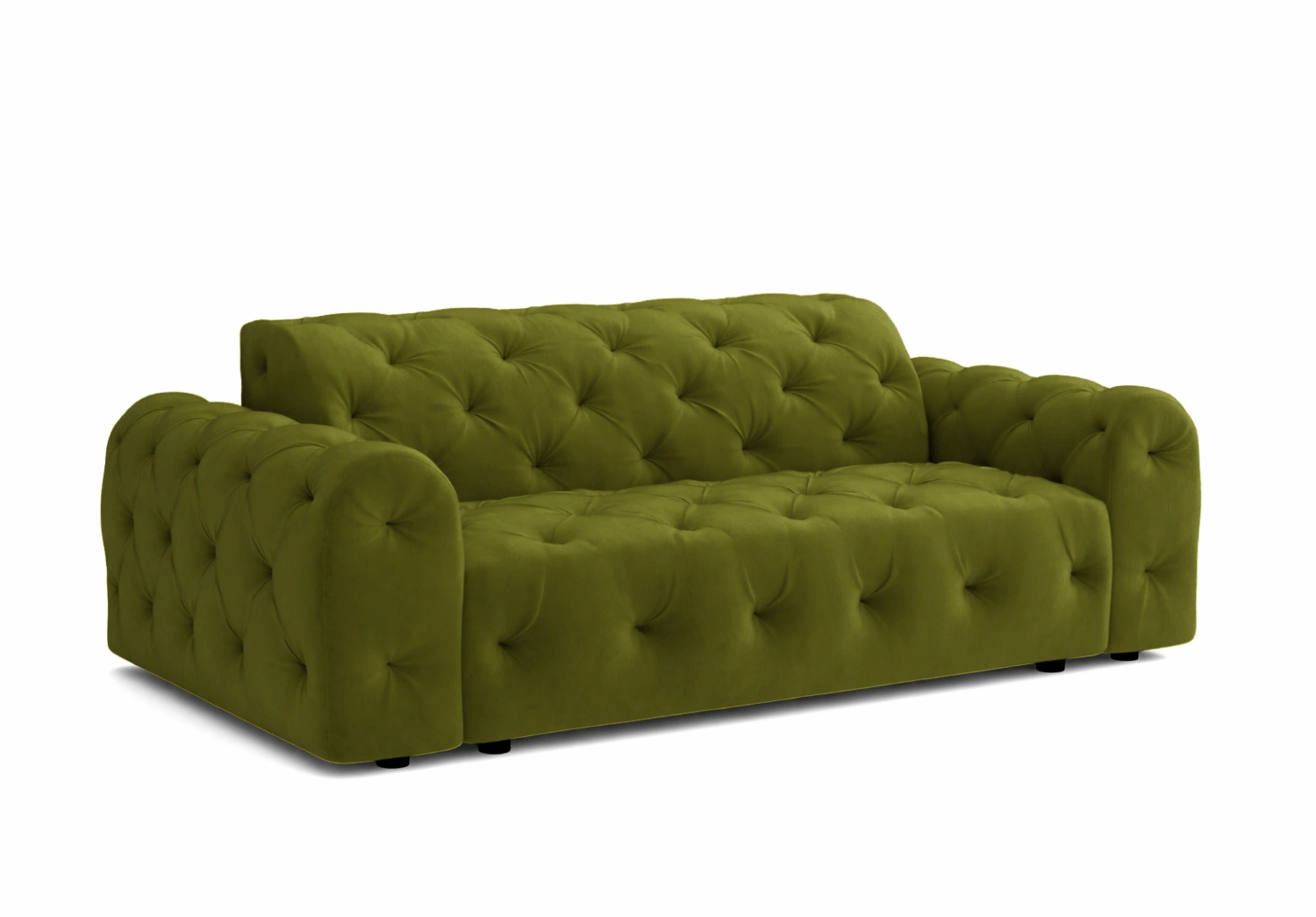 • Głębokie pikowania z ozdobnymi guzikami tworzą eleganckie, romboidalne zagłębienia na powierzchni tapicerki.