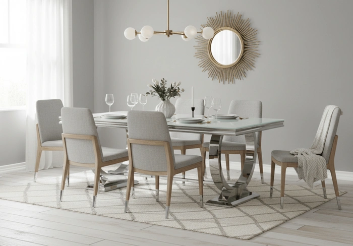 Inspiracja estetyką Dalekiego Wschodu widoczna jest w symetrycznej, wyważonej konstrukcji oraz dekoracyjnym charakterze podstawy. Połyskujące elementy w kolorze srebra doskonale kontrastują z jasnym blatem, nadając stołu wyjątkowo ekskluzywny wygląd. To idealny wybór do wnętrz w stylu glamour, nowojorskim, art déco oraz modern classic.