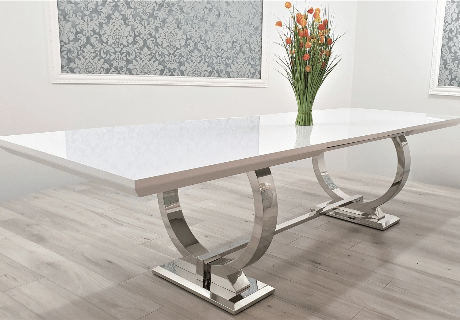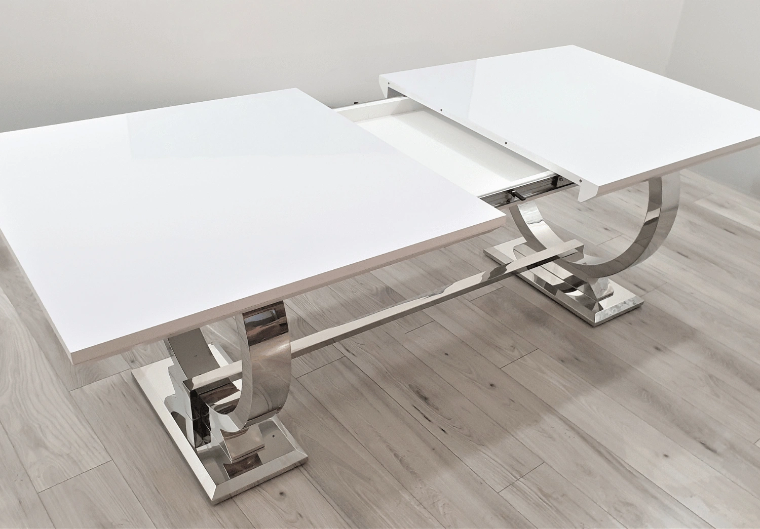 • Stół glamour z prostokątnym białym blatem i efektowną chromowaną podstawą w formie podwójnych pierścieni. Eleganckie połączenie bieli i srebra nadaje meblowi luksusowy charakter, idealny do wnętrz w stylu glamour, nowojorskim i art déco.