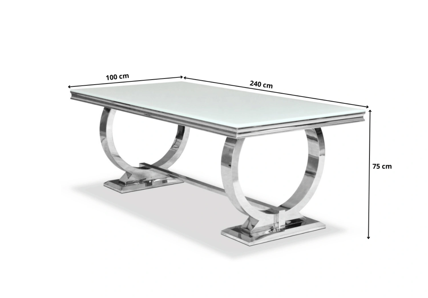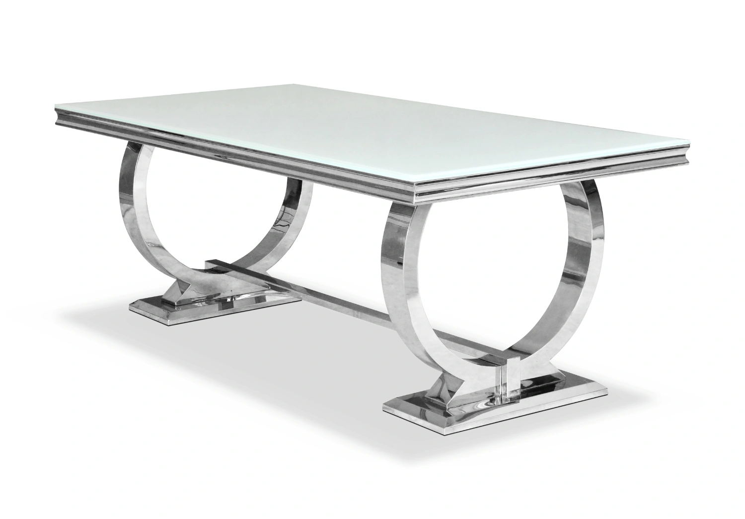 Elegancki chiński stół glamour to luksusowy mebel zaprojektowany z myślą o nowoczesnych i prestiżowych wnętrzach.  Model wyróżnia się prostokątnym białym blatem o gładkim, eleganckim wykończeniu oraz efektowną chromowaną podstawą w formie dwóch geometrycznych pierścieni, osadzonych na stabilnych stopach.