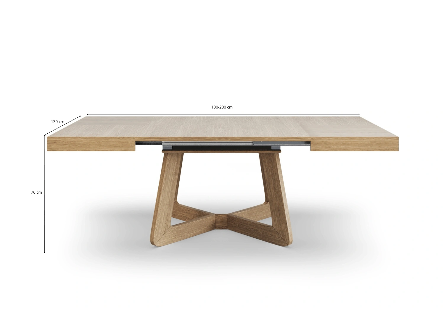 Stół OLGIERD T69 to nowoczesny i elegancki kwadratowy stół rozkładany, który łączy w sobie funkcjonalność, solidne wykonanie oraz ponadczasowy design. Dzięki możliwości rozłożenia blatu z 130 cm do aż 230 cm doskonale sprawdzi się zarówno w codziennym użytkowaniu, jak i podczas większych spotkań rodzinnych czy towarzyskich. Naturalny dębowy fornir oraz charakterystyczne krzyżowe nogi czynią go wyjątkowym elementem każdej jadalni lub salonu.