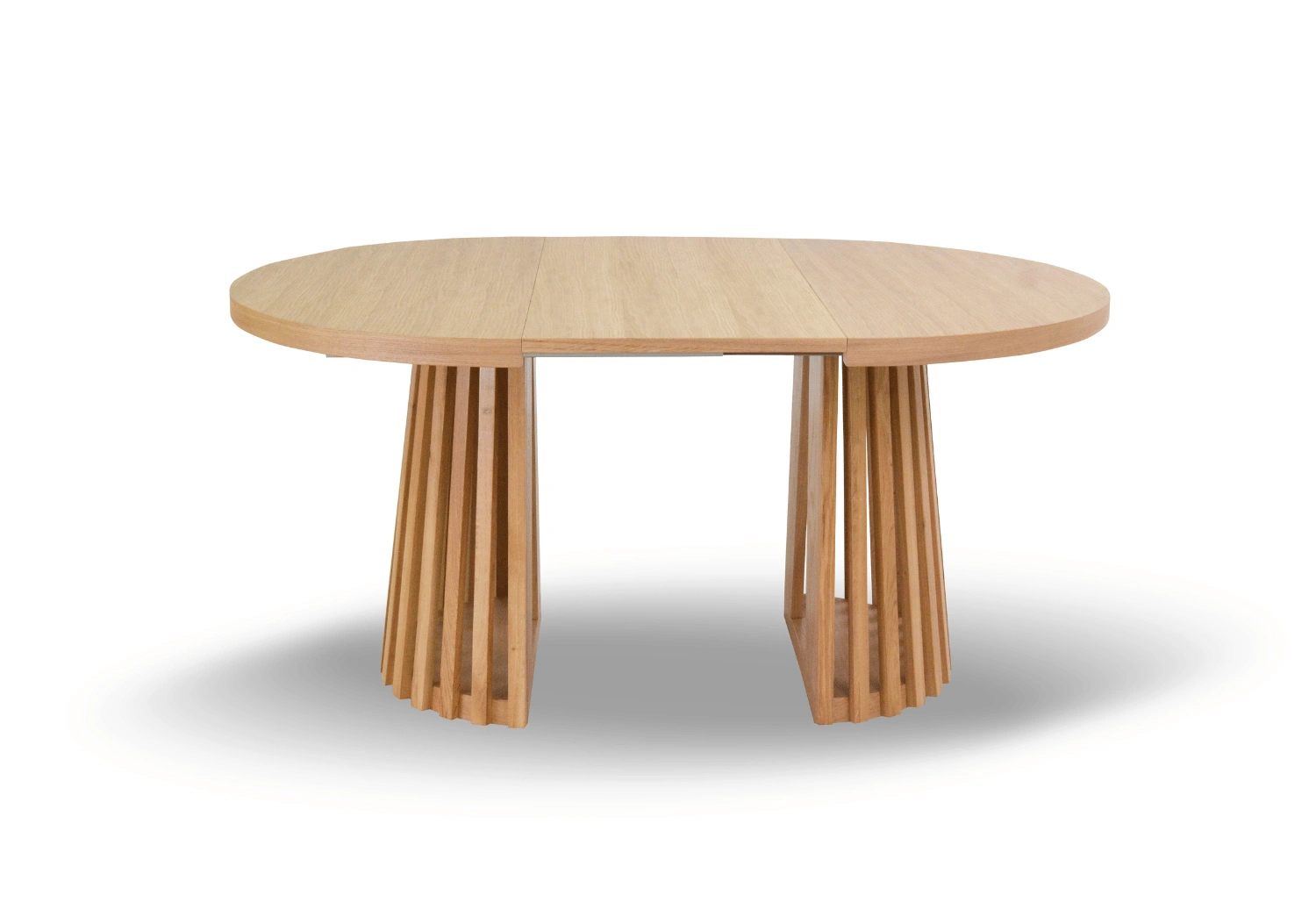• Okrągły stół 110–210 cm to elegancki i funkcjonalny mebel idealny do jadalni i salonu. Dzięki nowoczesnemu systemowi rozkładania oferuje dużą przestrzeń dla gości, a naturalny fornir dębowy i oryginalne lamele nadają mu luksusowy, nowoczesny charakter.