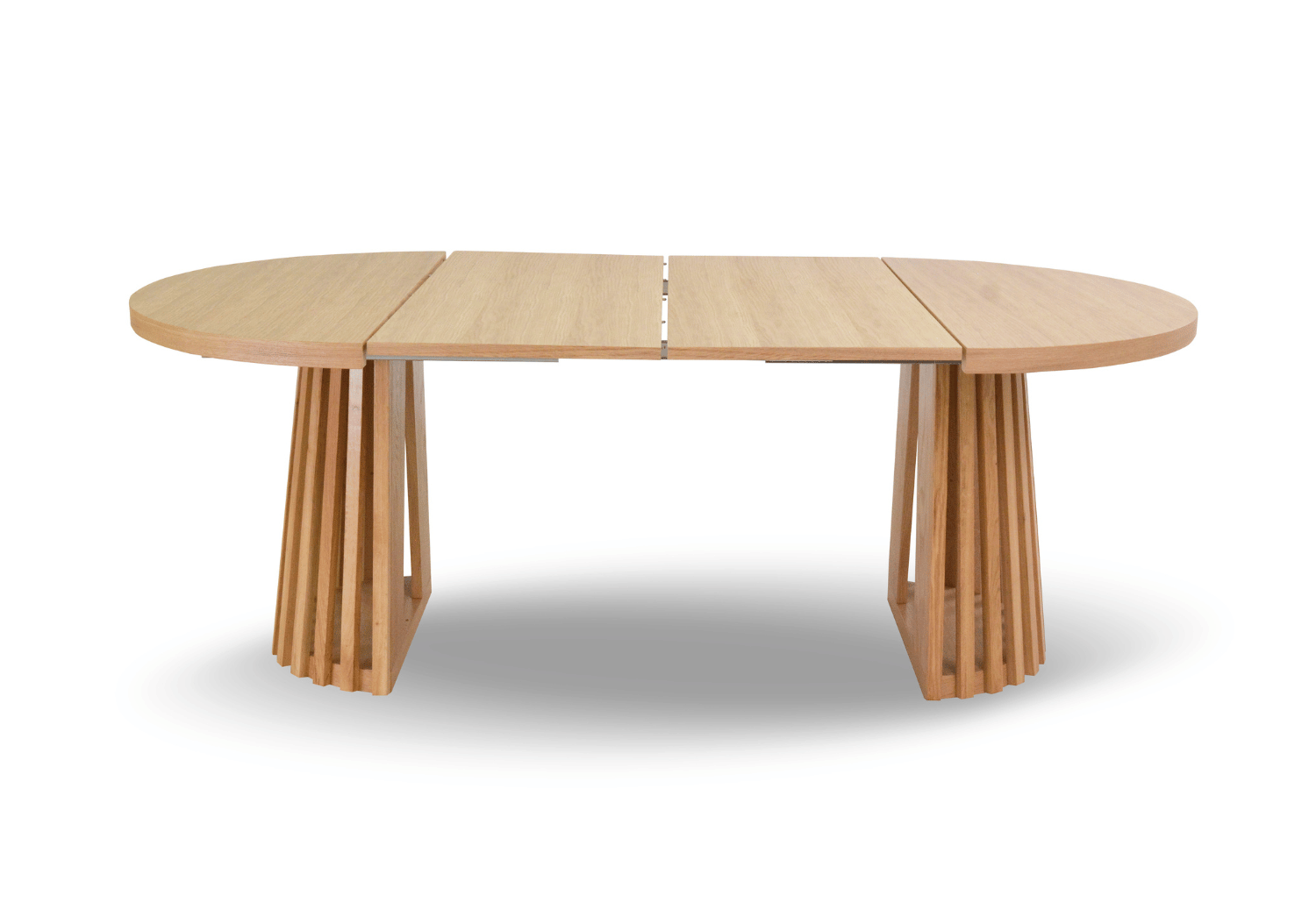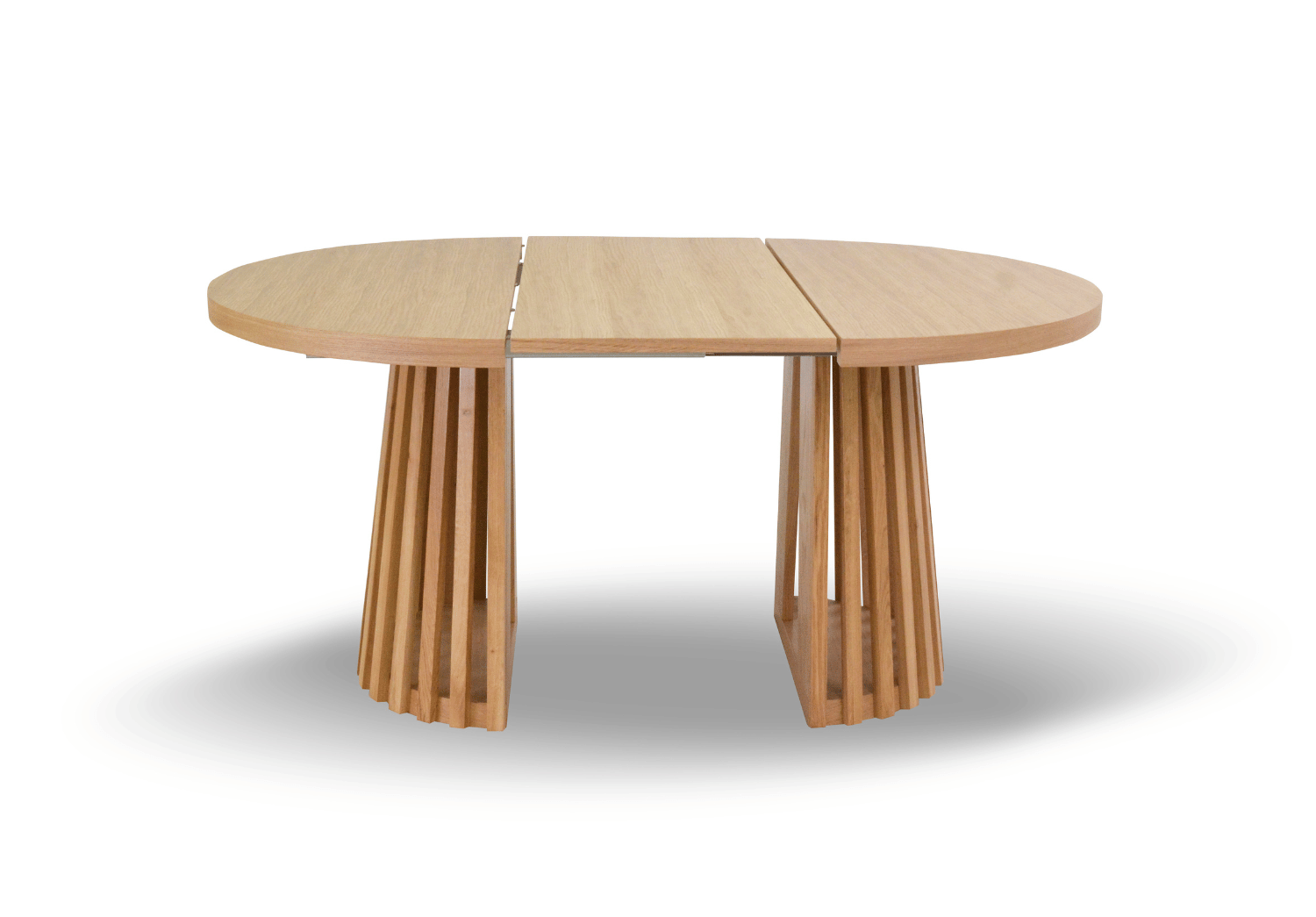 - Okrągły stół 110–210 cm to elegancki i funkcjonalny mebel idealny do jadalni i salonu. Dzięki nowoczesnemu systemowi rozkładania oferuje dużą przestrzeń dla gości, a naturalny fornir dębowy i oryginalne lamele nadają mu luksusowy, nowoczesny charakter.