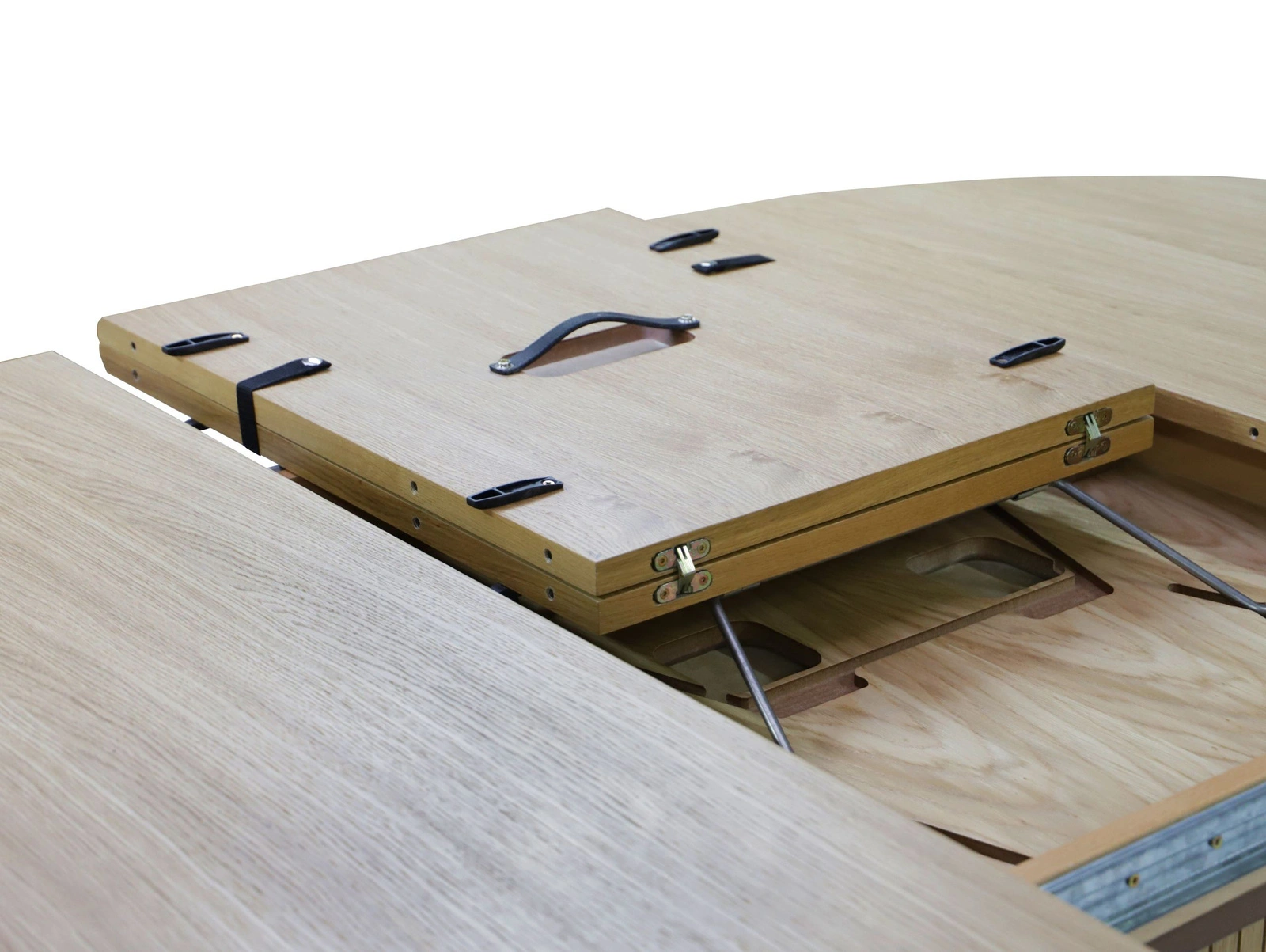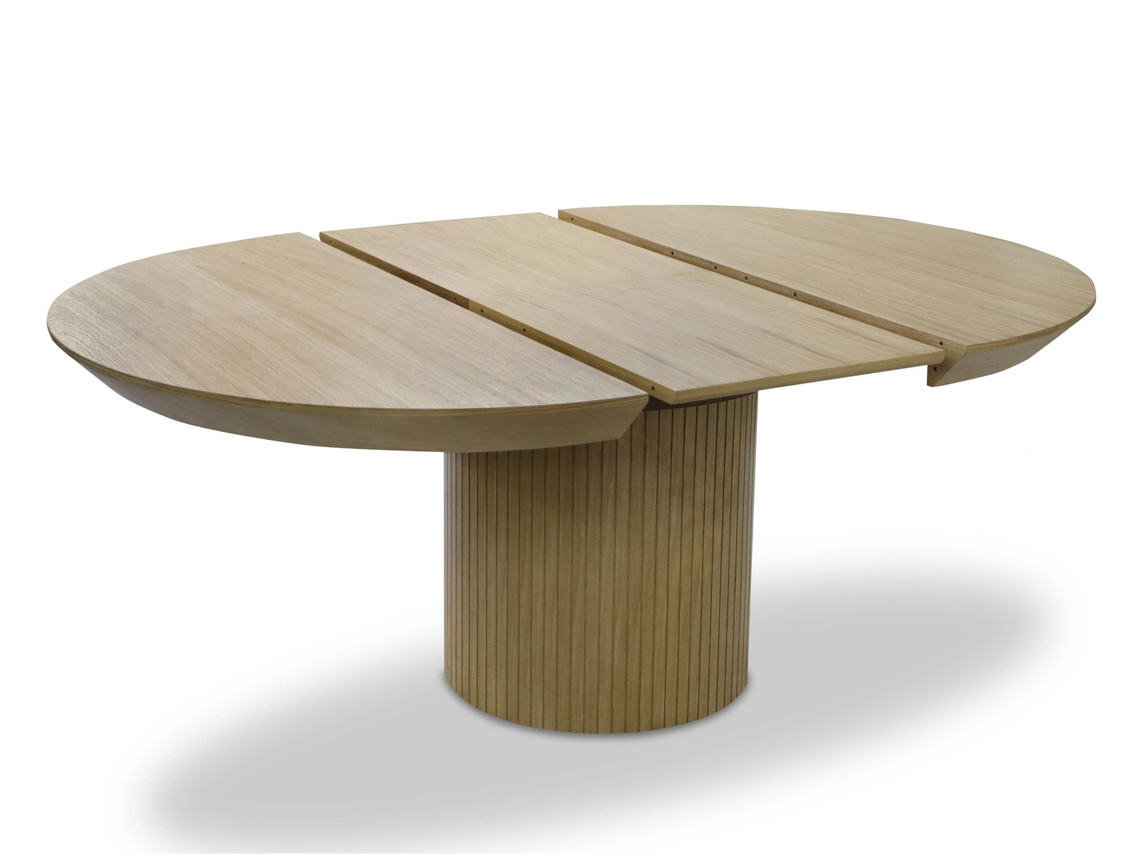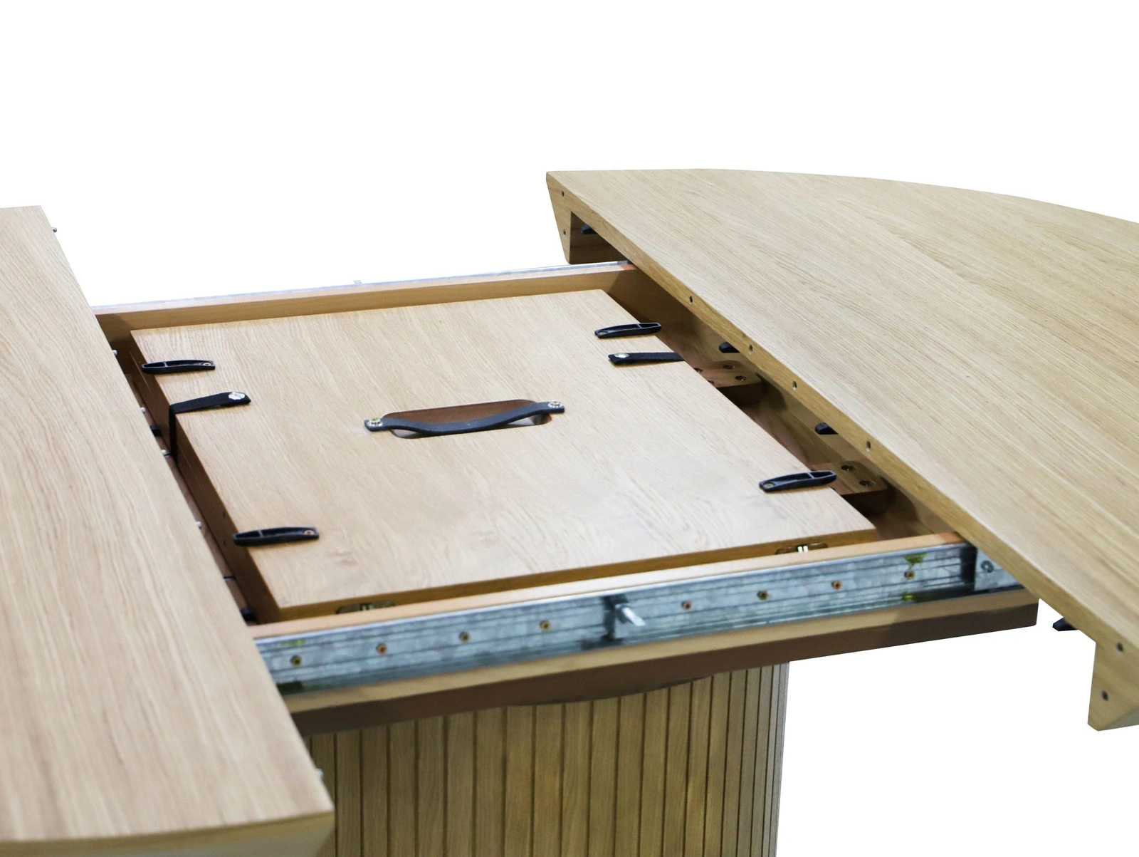 • Stół DARIUSZ T68 to okrągły stół rozkładany 130–180 cm z blatem i ryflowaną nogą fornirowanymi naturalnym dębem. Nowoczesny design, solidna konstrukcja i możliwość wyboru wybarwienia idealnie sprawdzą się w eleganckiej jadalni lub salonie.