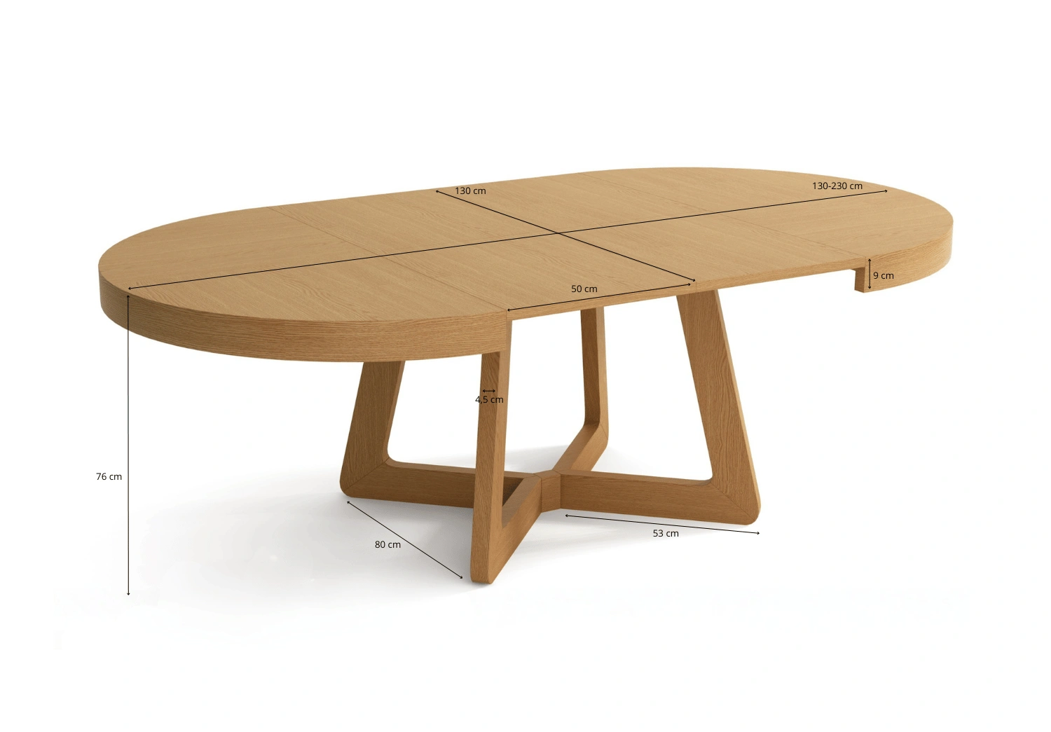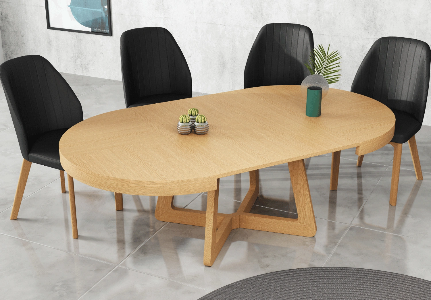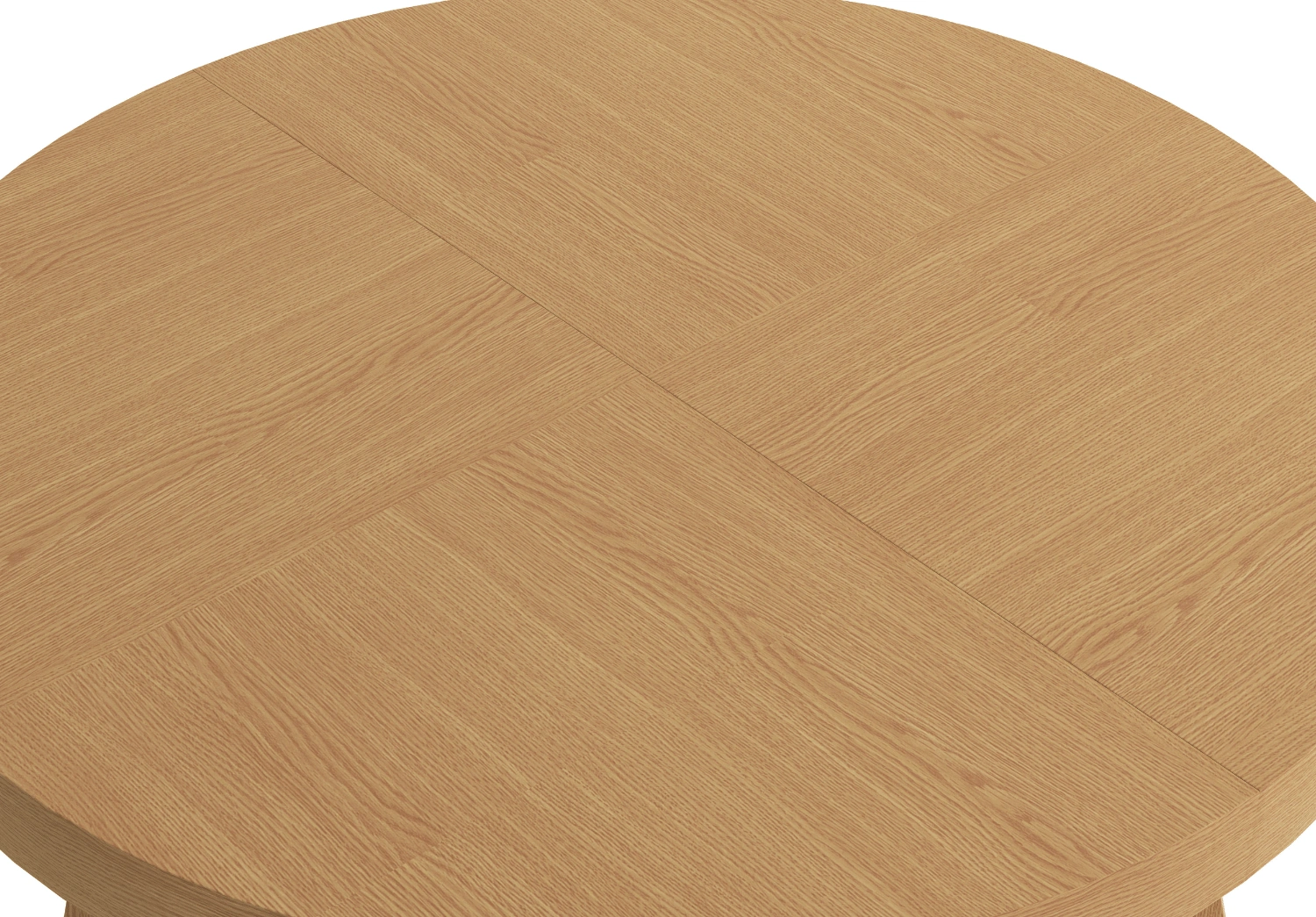 Stół T40 to elegancki, funkcjonalny i ponadczasowy mebel, który doskonale sprawdzi się w każdym stylowym wnętrzu. Jego okrągła forma oraz możliwość rozkładania do aż 230 cm sprawiają, że jest idealnym wyborem zarówno do codziennych posiłków, jak i większych spotkań rodzinnych. Solidna konstrukcja z litego drewna oraz piękny blat z naturalnym dębowym fornirem czynią go wyjątkowym elementem wyposażenia każdego domu.