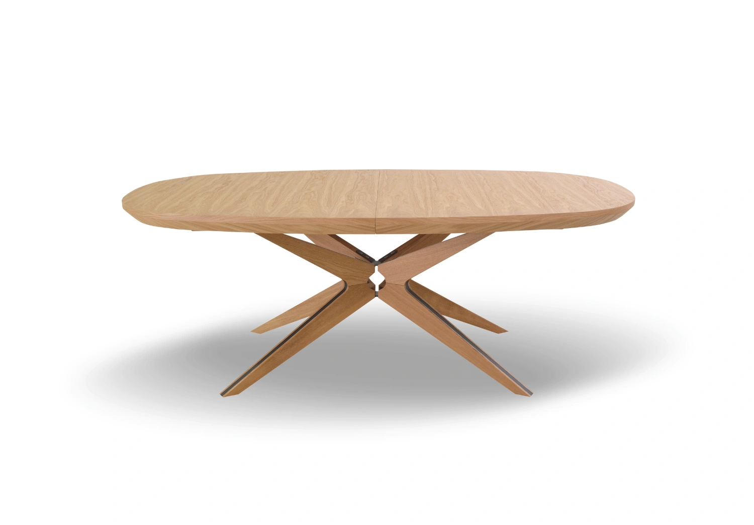 Nogi zostały wykonane ze sklejki dębowej giętej klejonej, co nadaje im lekkości wizualnej i eleganckiego, nowoczesnego charakteru. Stabilność stołu zapewnia solidna konstrukcja oraz teleskopowa prowadnica synchroniczna, dzięki której rozkładanie mebla jest szybkie, intuicyjne i płynne.