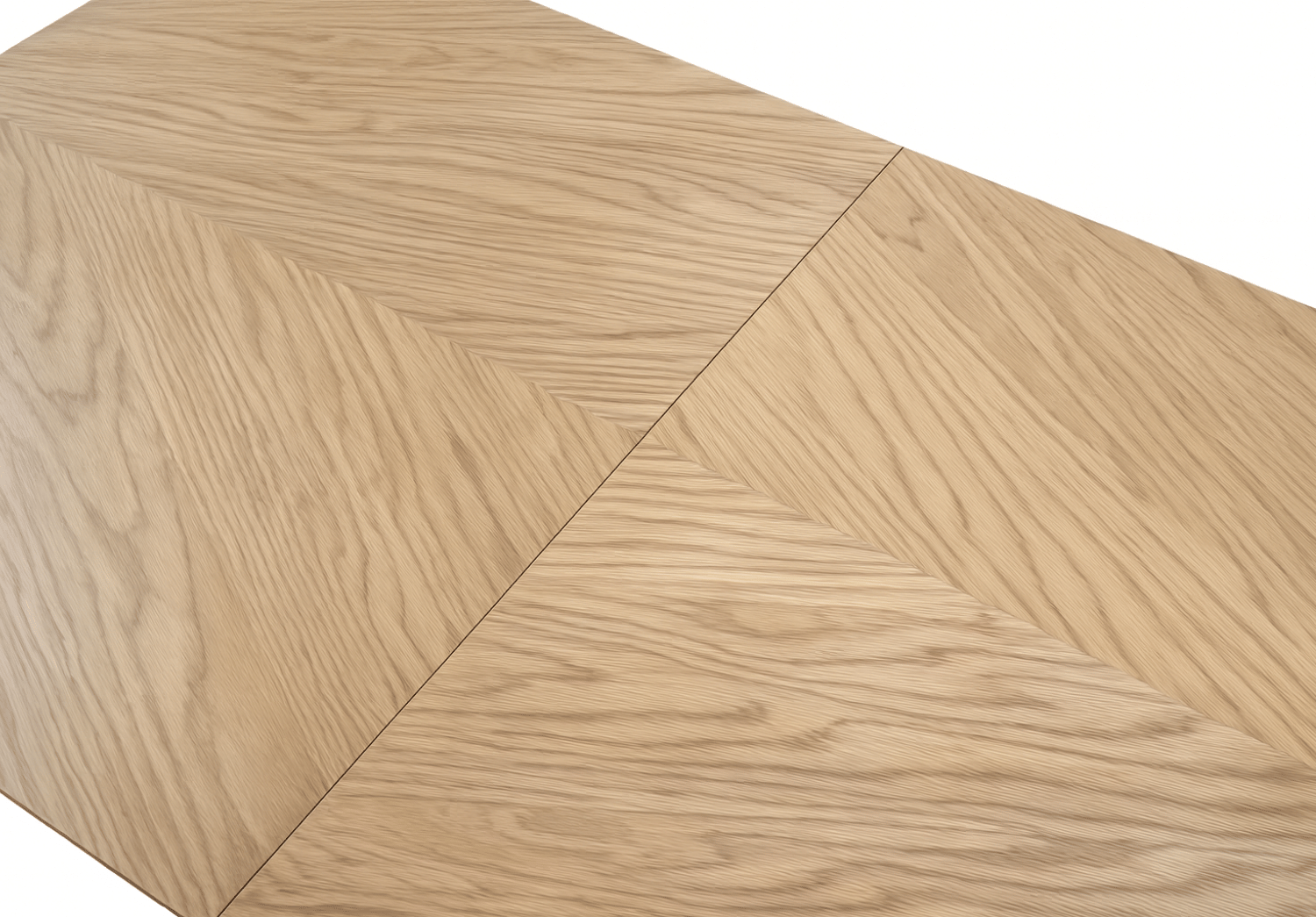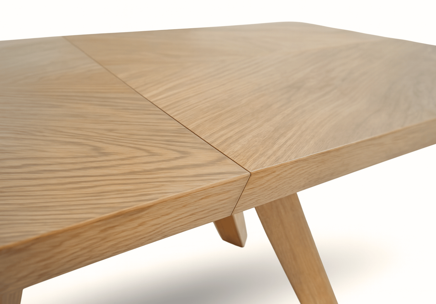 Stół Tadeusz został wykonany z najwyższej jakości materiałów. Blat stołu to płyta MDF fornirowana naturalną okleiną dębową, pokryta lakierem poliuretanowym odpornym na zarysowania, co gwarantuje trwałość i odporność na codzienne użytkowanie. Nogi wykonane są z litego drewna dębowego, zapewniając stabilność i solidność konstrukcji. System rozkładania POTTKER oraz cztery chowane wkładki pod blatem umożliwiają łatwe dostosowanie stołu do potrzeb domowników.