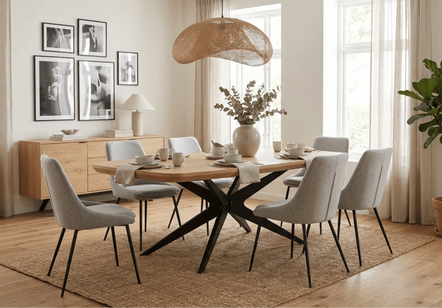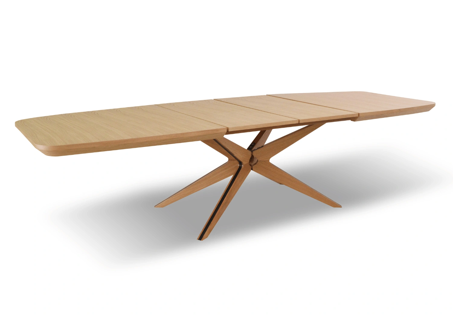 Stół Mieszko T78 wyposażono w teleskopową prowadnicę synchroniczną, co zapewnia szybkie i wygodne rozkładanie blatu. Dwie wkładki chowane pod blatem sprawiają, że dodatkowa przestrzeń jest zawsze pod ręką, bez potrzeby przechowywania jej poza stołem. Dzięki temu mebel łączy estetykę z praktycznością, stanowiąc idealne rozwiązanie dla wymagających użytkowników.