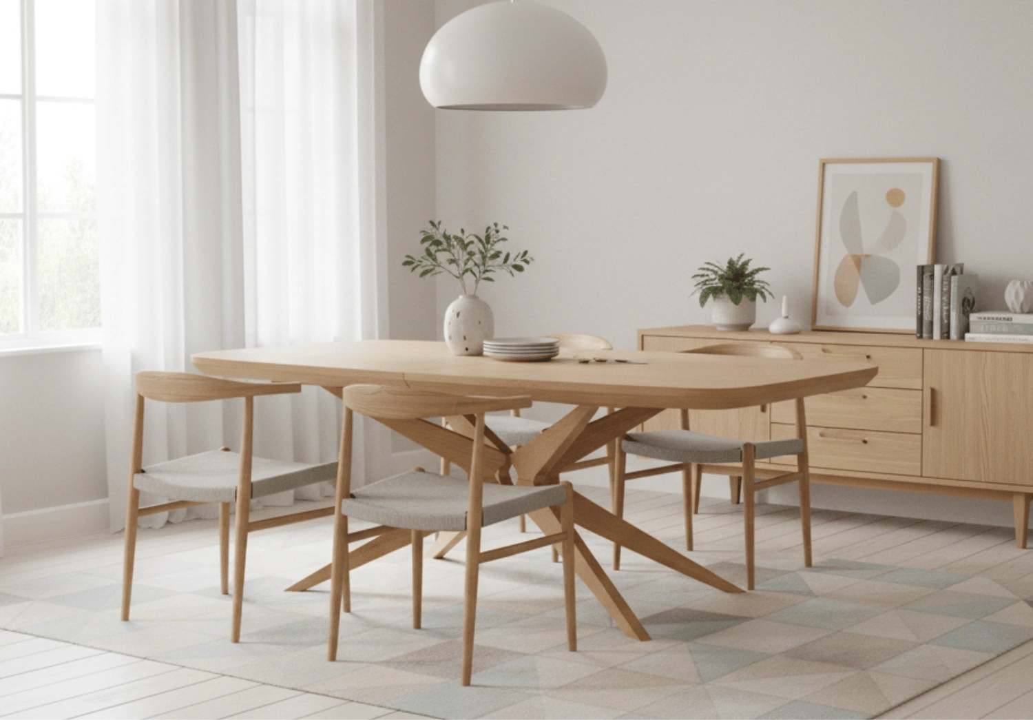 Blat stołu wykonany jest z trwałej płyty MDF, pokrytej naturalnym fornirem dębowym, który nadaje meblowi ciepły i ponadczasowy charakter. Wykończenie lakierem poliuretanowym zabezpiecza powierzchnię przed zarysowaniami i podnosi odporność na codzienne użytkowanie. Gięte, dębowe nogi wykonane ze sklejki dodają całości lekkości i elegancji, zachowując jednocześnie stabilność nawet przy pełnym rozłożeniu.