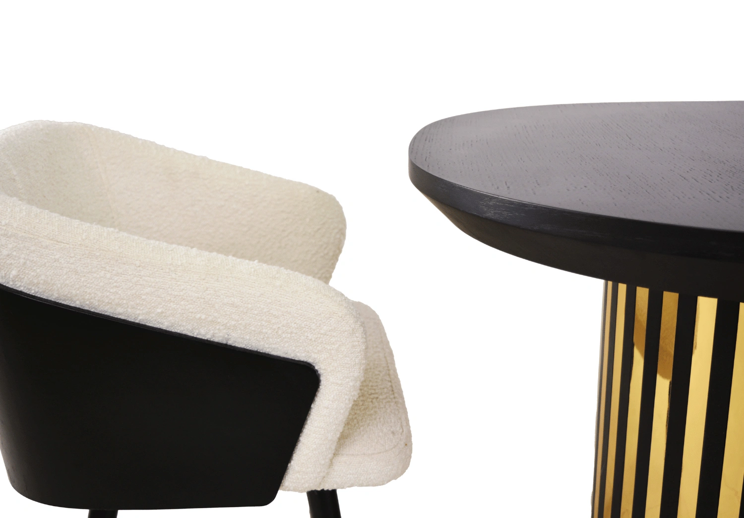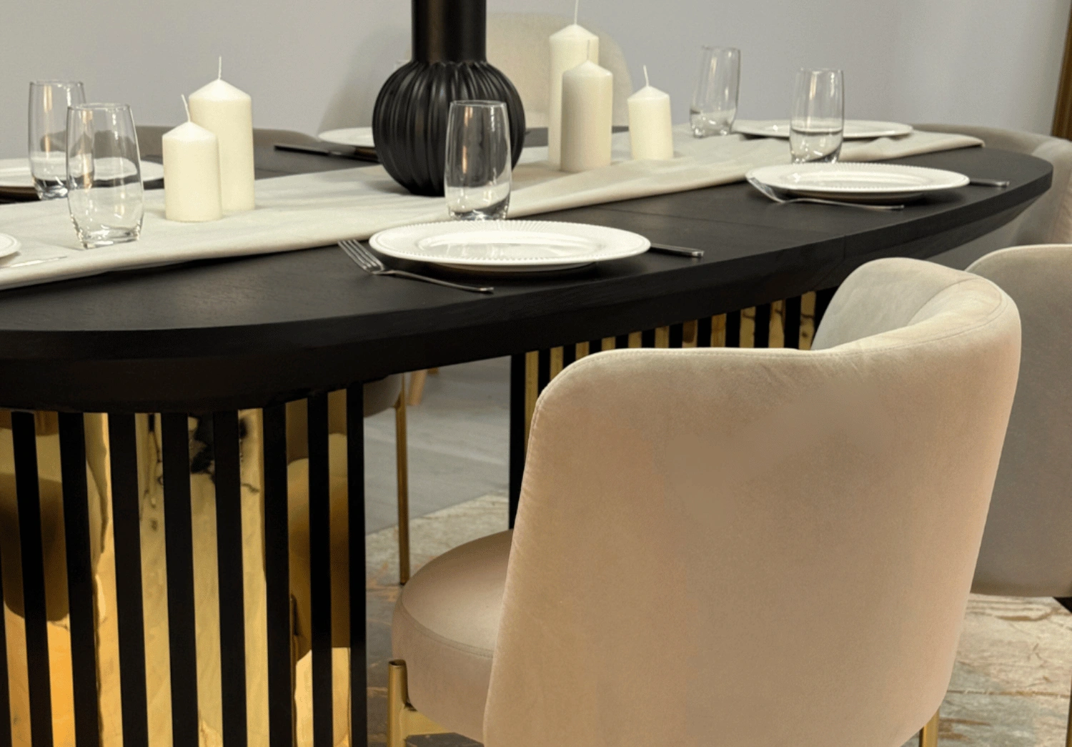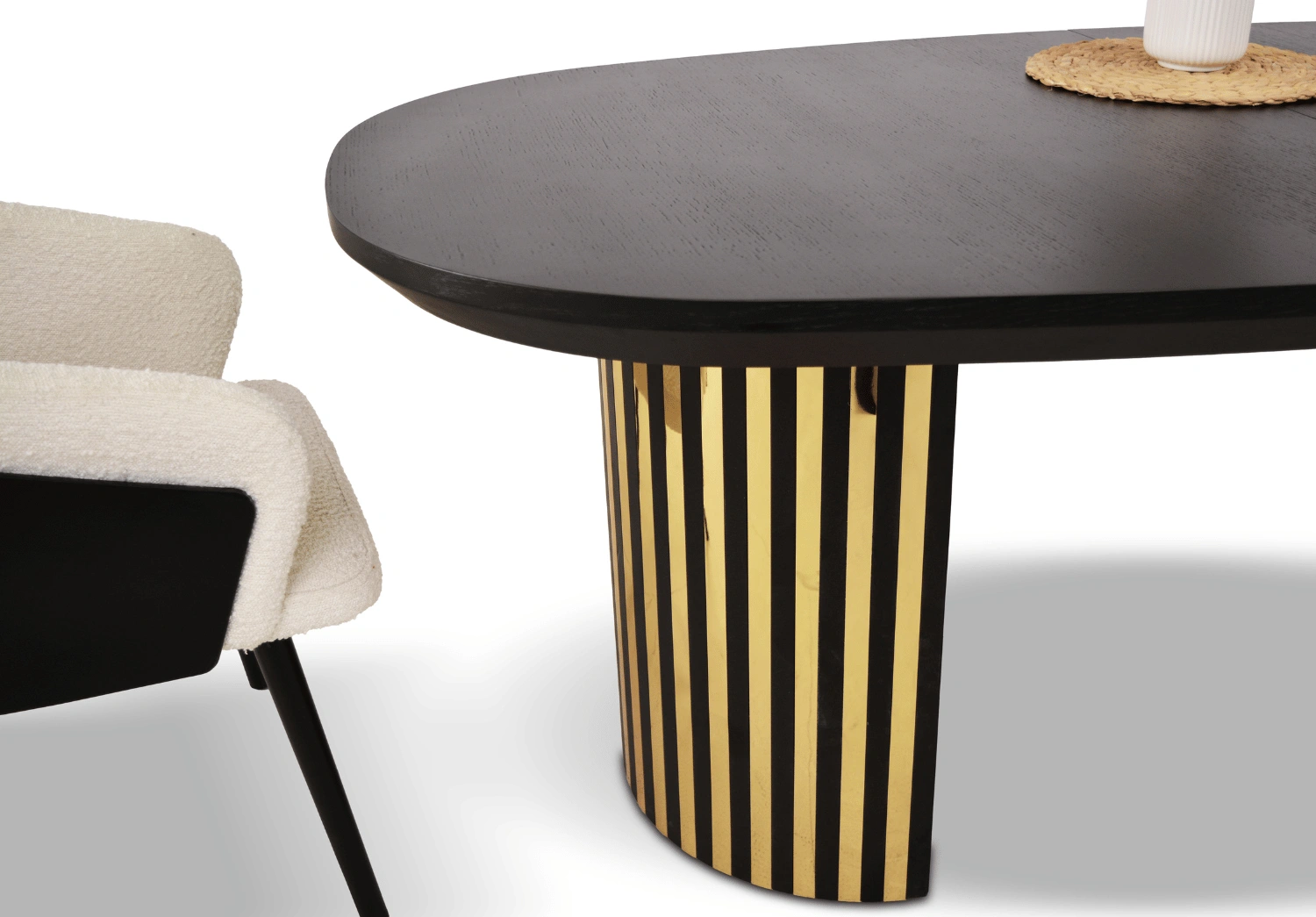 • Nogi stołu mają oryginalną, ryflowaną strukturę, co podkreśla elegancję i estetyczny charakter mebla. Są pokryte naturalnym fornirem dębowym, dzięki czemu zachowują spójność kolorystyczną z blatem.