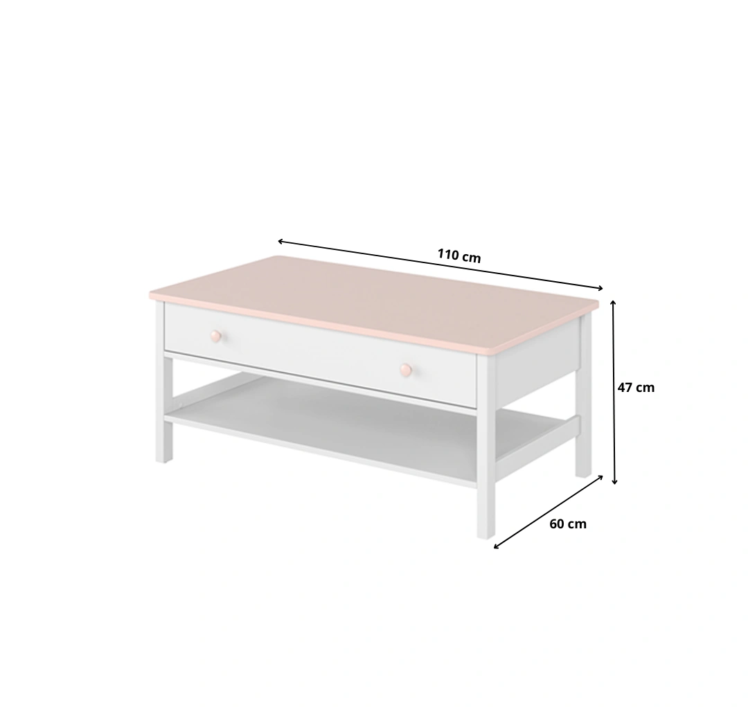 Nowoczesny i praktyczny stolik kawowy z kolekcji LYSSA to połączenie funkcjonalności i dziewczęcego uroku. Wyposażony w pojemną szufladę oraz półkę, idealnie sprawdzi się w pokoju młodzieżowym – do nauki, relaksu i wspólnych spotkań.