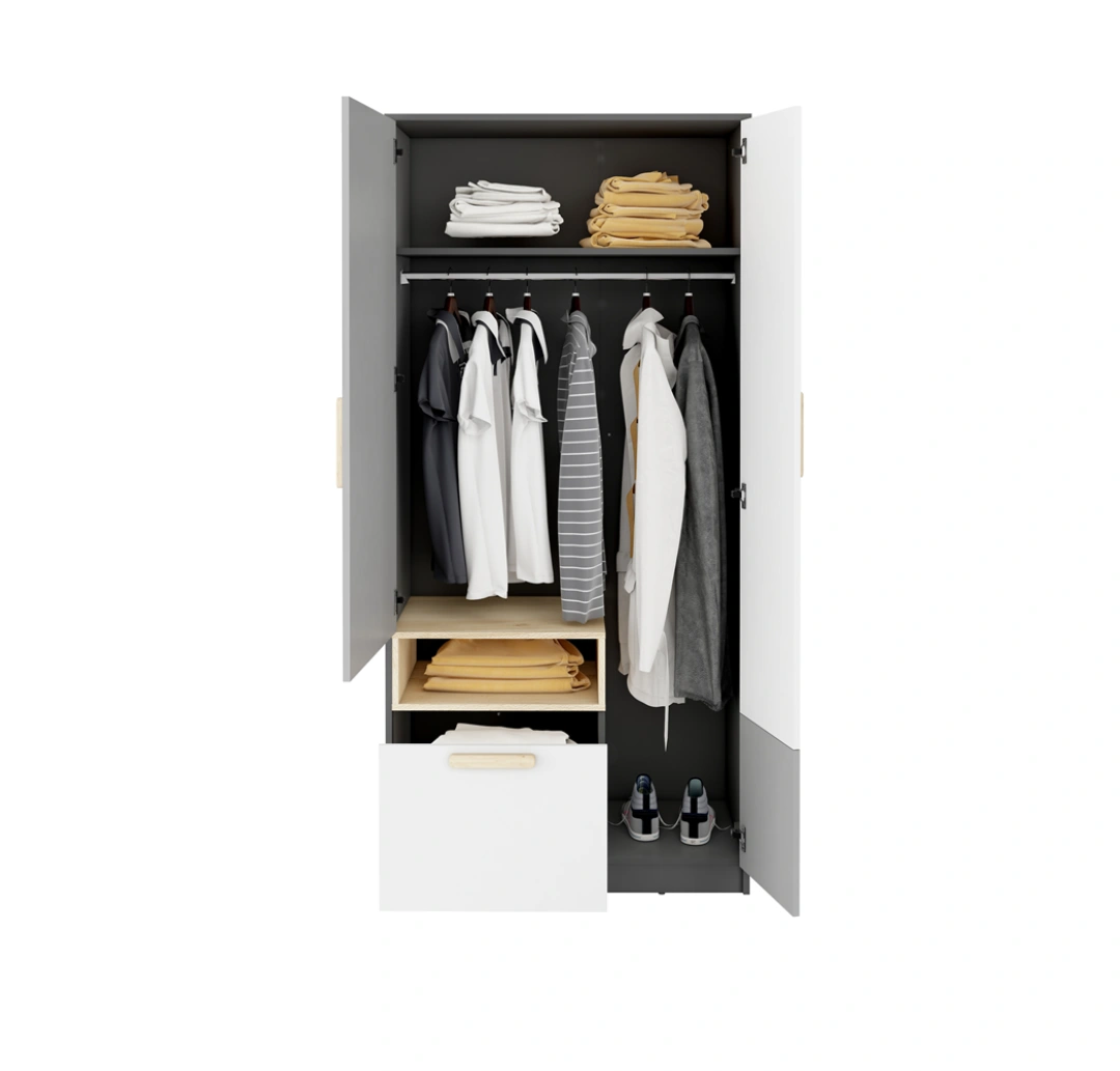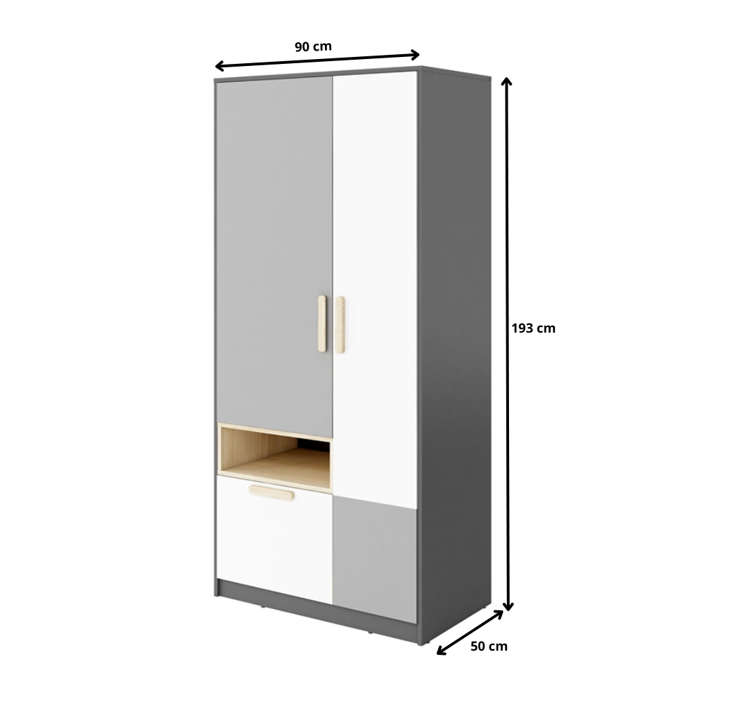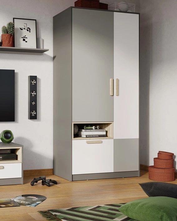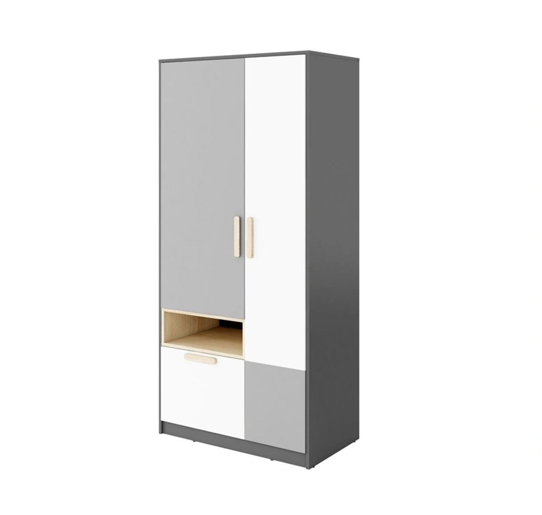 Nowoczesna, kompaktowa szafa, idealna do pokoju młodzieżowego. Zawiera drzwi oraz jedną szufladę, co zapewnia praktyczne przechowywanie ubrań i drobnych przedmiotów. Estetyczne połączenie grafitu, jasnego szarego i drewna bukowego nadaje wnętrzu elegancki i świeży wygląd.