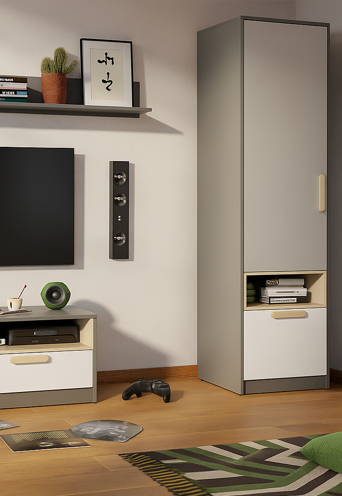 Funkcjonalna i nowoczesna szafka, wyposażona w jedne drzwi oraz jedną szufladę. Idealna do pokoju młodzieżowego, zapewnia praktyczne miejsce na ubrania i drobiazgi. Stylowa kolorystyka łączy głęboki grafit z naturalnym bukiem oraz jasnoszarymi frontami, tworząc eleganckie i uniwersalne rozwiązanie do każdego wnętrza.