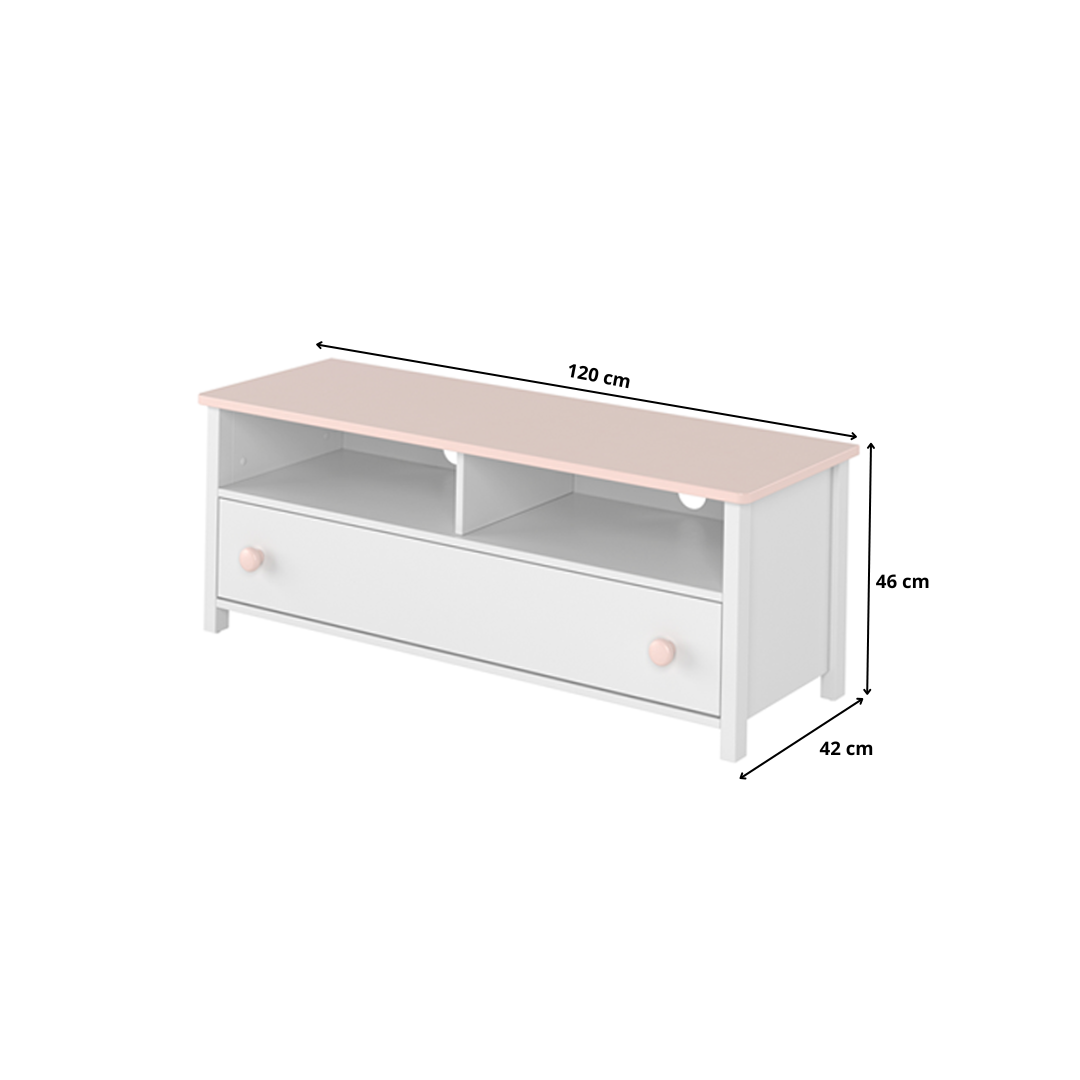 Praktyczna i estetyczna szafka RTV z jedną szufladą i otwartą półką, która doskonale sprawdzi się w pokoju młodzieżowym. Subtelne połączenie białego alpejskiego z różowym akcentem podkreśla nowoczesny charakter.