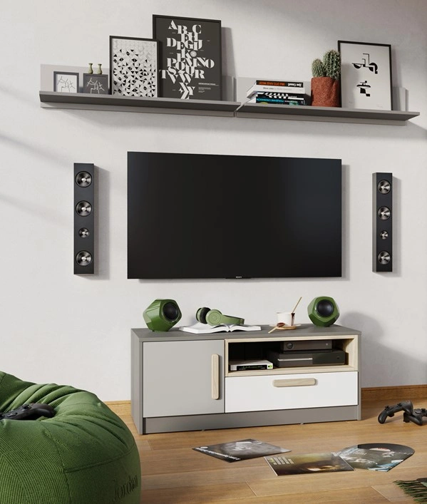 Nowoczesna szafka RTV, zaprojektowana z myślą o funkcjonalności i stylu w pokoju młodzieżowym. Pojemna i solidna, z miejscem na sprzęt multimedialny, akcesoria i dekoracje. Kompaktowe wymiary pozwalają na łatwe dopasowanie mebla do różnych przestrzeni.